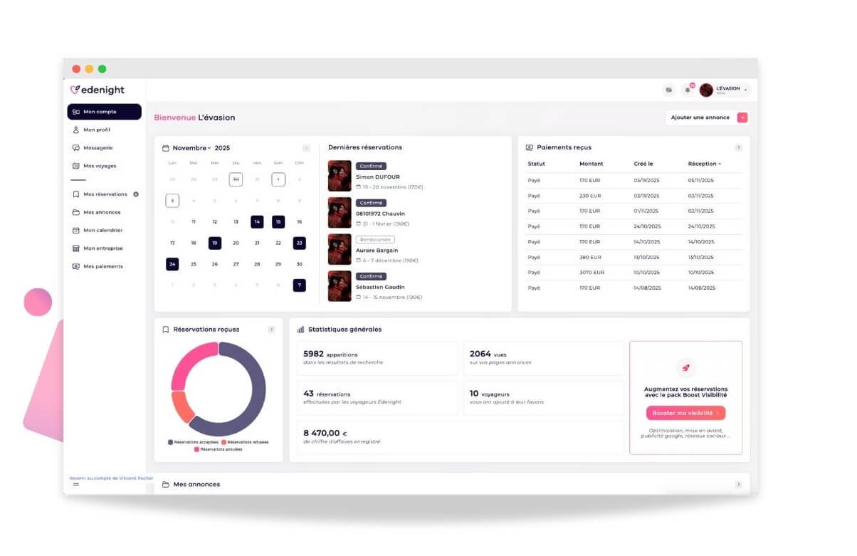 Edenight vous offre l’accès à un tableau de bord doté d’une interface simple et intuitive pour :
