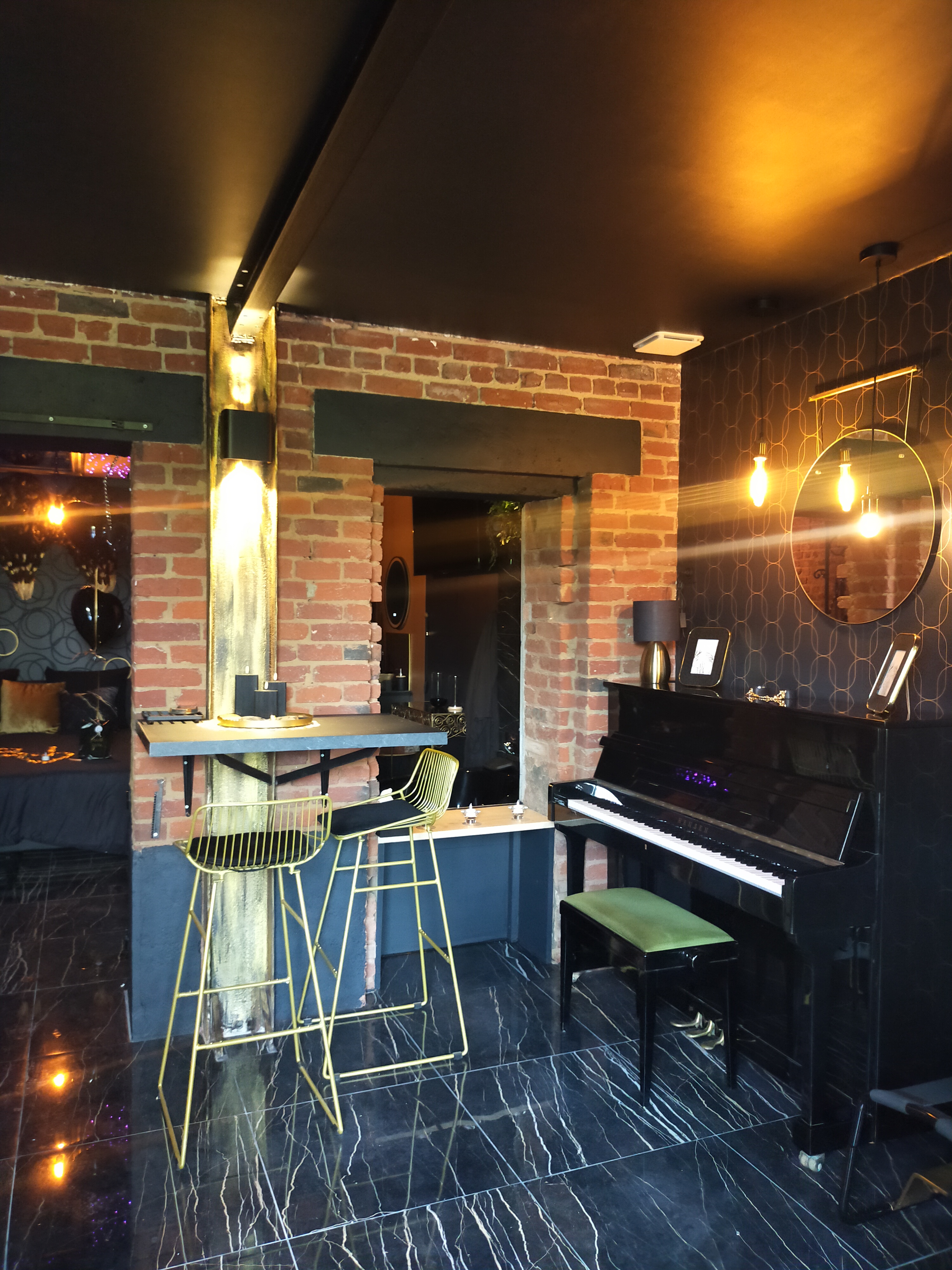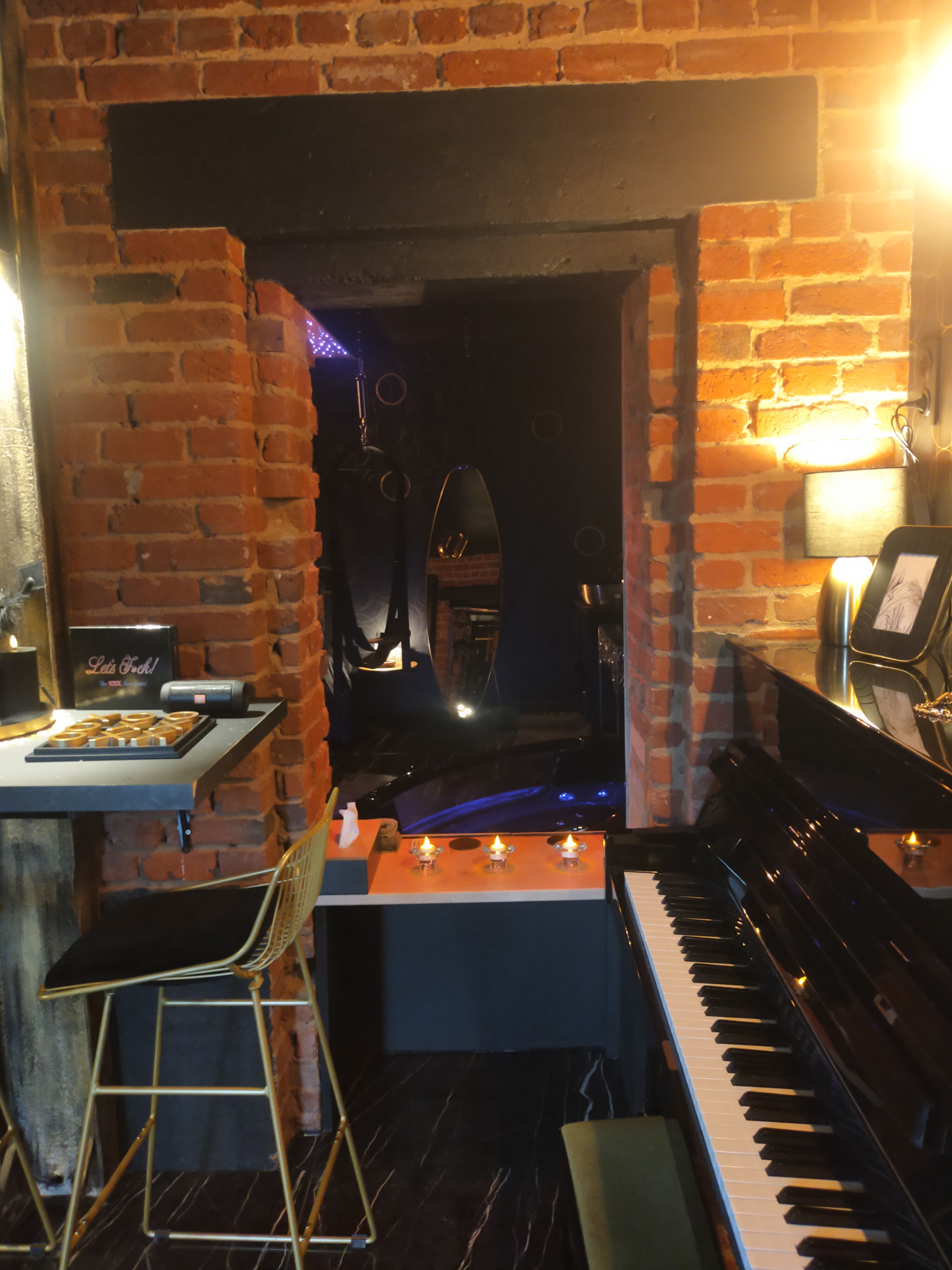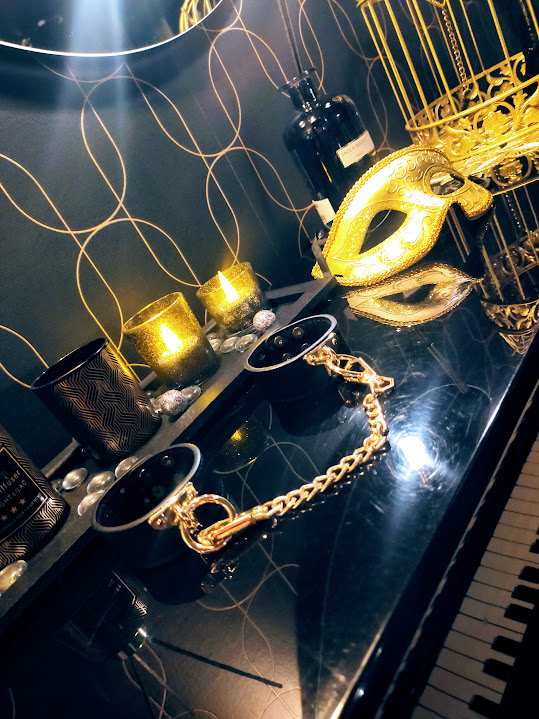 Située dans l’Artois, à quelques minutes de Lens et Arras, cette love room de luxe est un véritable cocon de tentation. Entièrement décorée dans un style noir et or chic, elle allie élégance, mystère et érotisme.