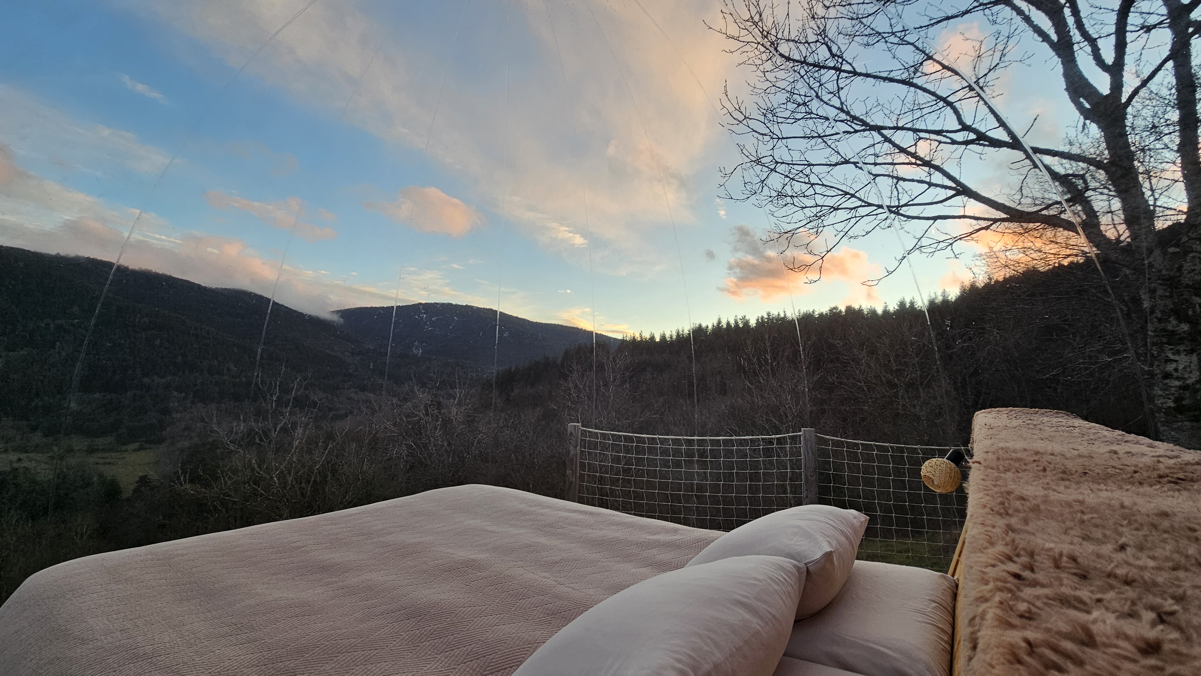 Installée sur une terrasse en bois avec vue sur les paysages ardéchois, cette bulle transparente vous permet de dormir face à la nature, dans une atmosphère douce et apaisante.