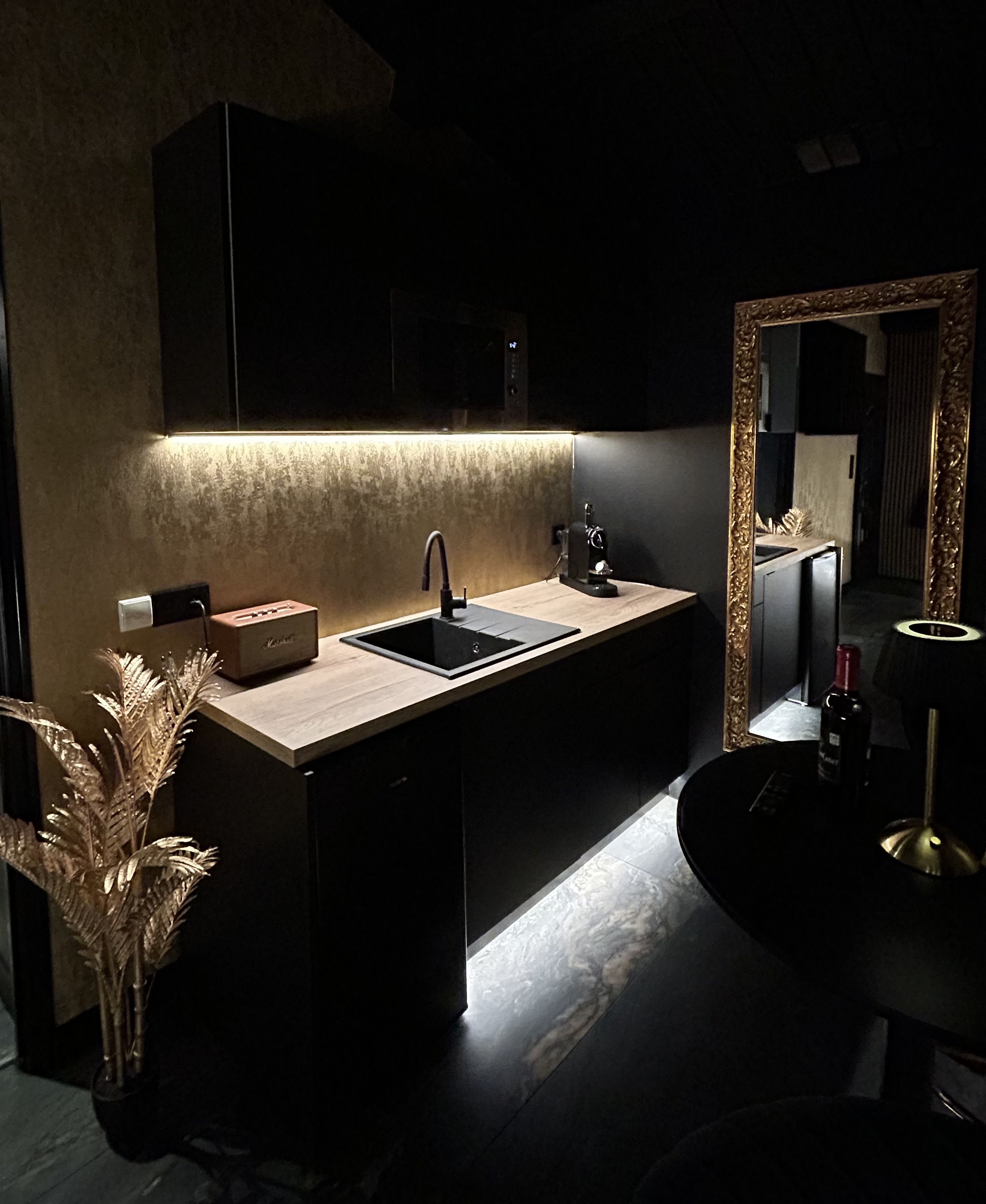 - d’un espace cuisine sans plaque chauffante, avec réfrigérateur, micro-ondes, bouilloire et cafetière, pour préparer vos petites douceurs et boissons en toute autonomie.