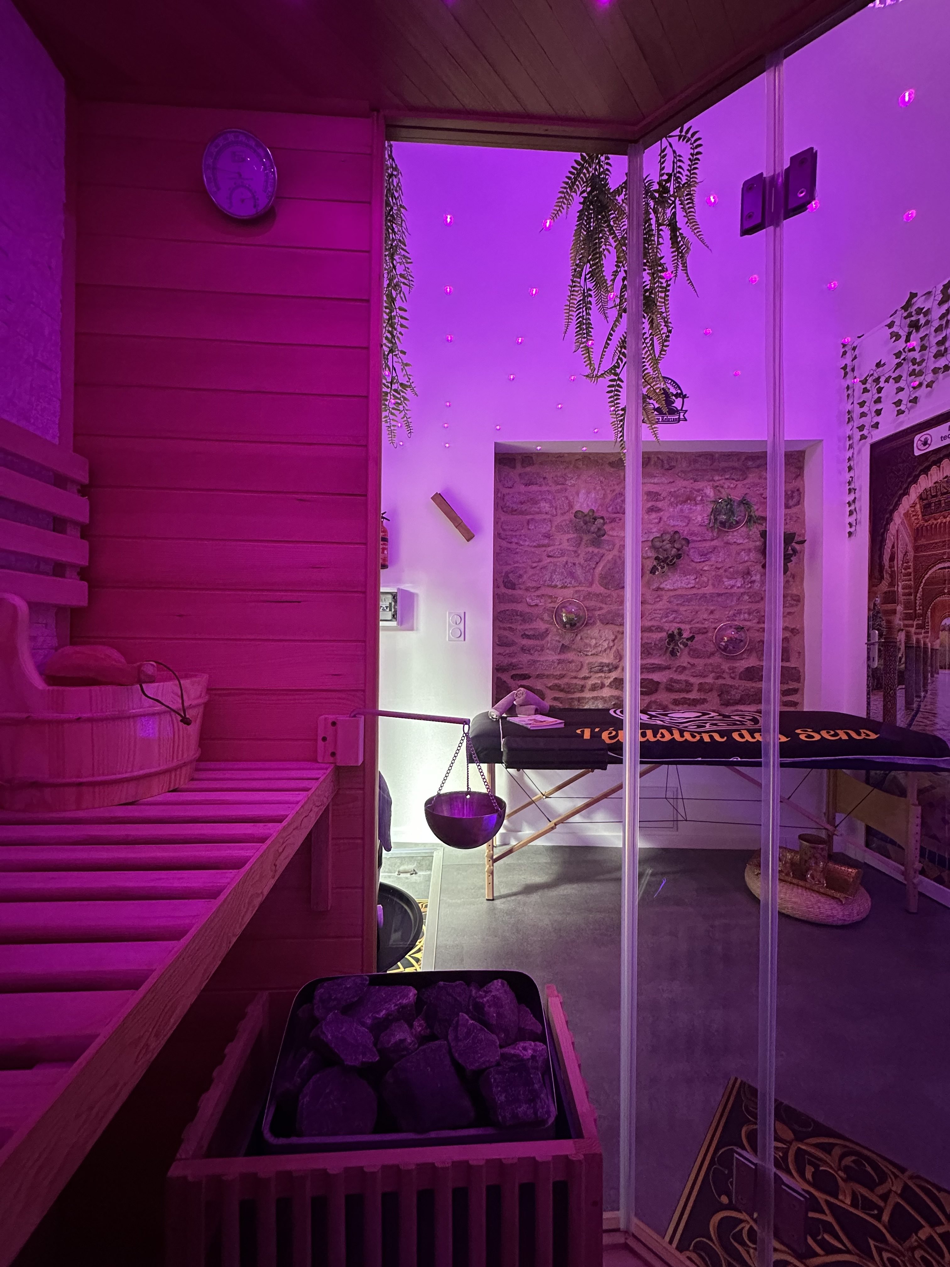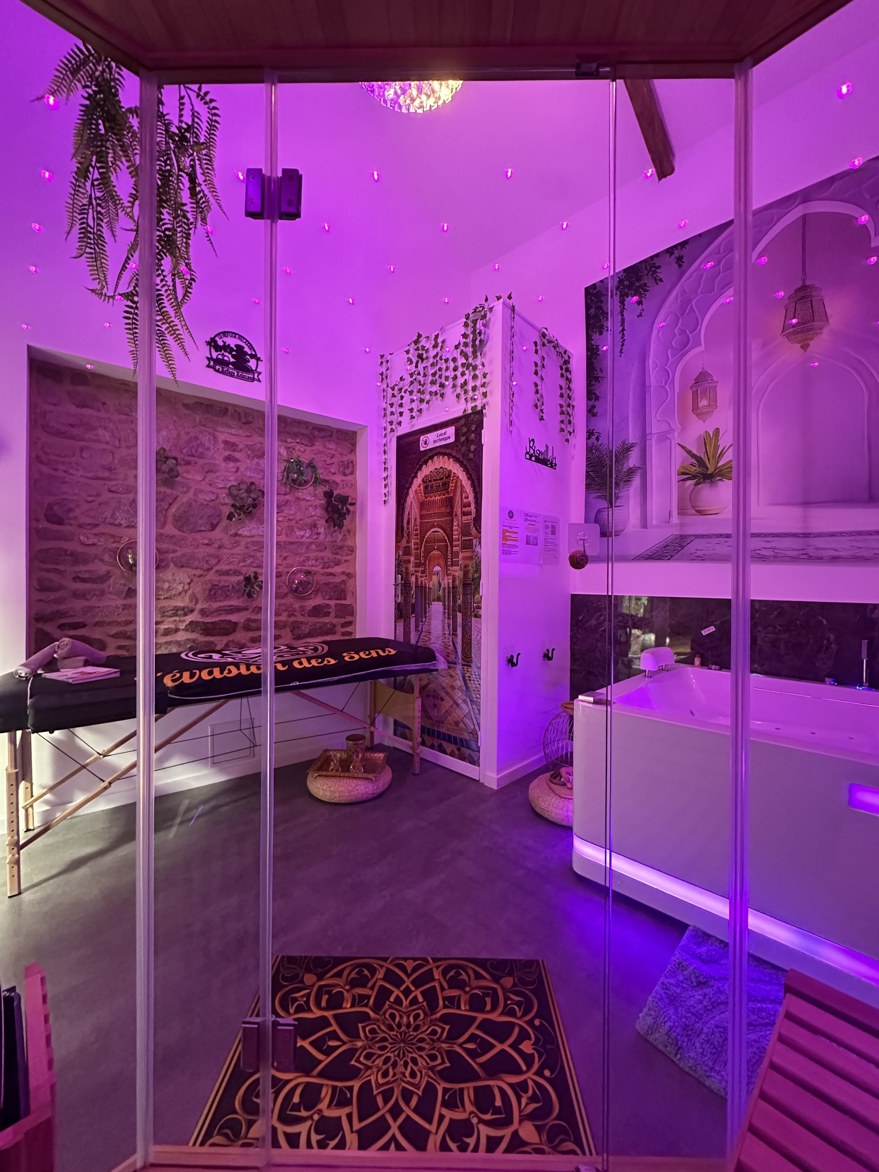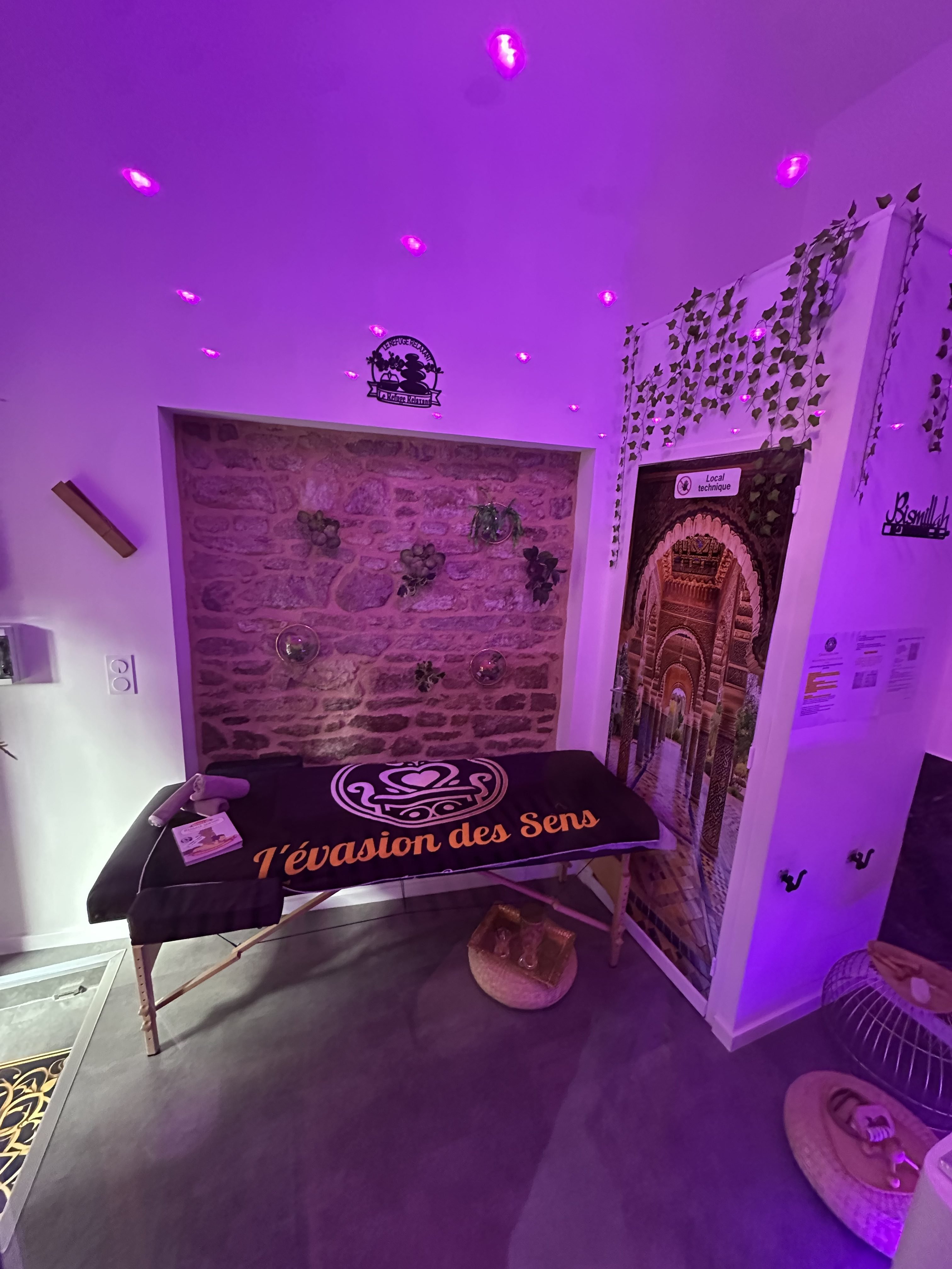 L’Évasion des Sens est une love room confidentielle située à Quessoy, en Côtes-d’Armor, à seulement 20 minutes de la mer. Nichée en pleine campagne bretonne, elle vous invite à vivre une expérience unique en duo, entre bien-être absolu et érotisme assumé. Un cocon intimiste, élégant et discret Dès votre arrivée, entrez en toute confidentialité grâce à une entrée indépendante avec digicode et un garage privé. Vous découvrez un univers chaleureux et raffiné : méridiennes élégantes, éclairage tamisé, tissus doux, cheminée cocooning, enceinte connectée et tablette à disposition pour ajuster l’ambiance selon vos envies. La cuisine est entièrement équipée (four, micro-ondes, four traditionnel, presse-orange, cave à vin, frigo, cafetière (avec dosettes) , bouilloire, etc.). À l’extérieur, une terrasse en bois ambiance patio, sans vis-à-vis, vous attend pour un moment de détente ou un apéritif en toute intimité. 🧖♀️ Espace bien-être : voyage sensoriel au cœur de l’Orient Le premier espace est une véritable invitation à la relaxation, inspirée des plus beaux riads marocains :