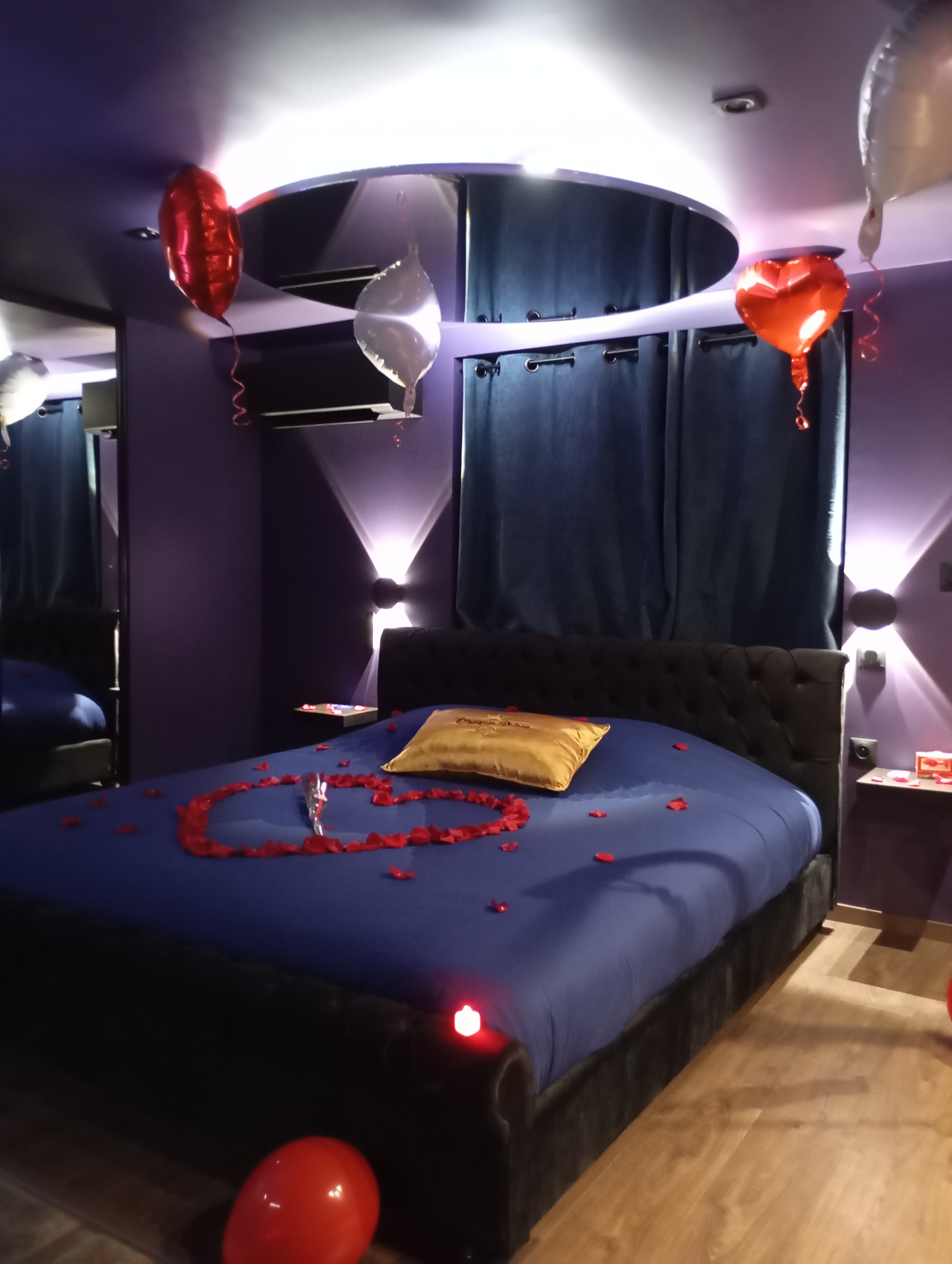 L’Instant Plaisir - Love room romantique dans l’Ain Bienvenue à L’Instant Plaisir, une love room romantique et sensuelle située à Bettant, dans l’Ain, à seulement 1h de Lyon. Un lieu unique pensé pour éveiller vos sens et vivre une parenthèse hors du temps, entre tendresse, détente et audace. Dès votre arrivée, plongez dans une atmosphère chaleureuse et raffinée. L’espace se compose d’un salon cosy avec cuisine équipée et mini-bar, d’une salle de bain moderne, et d’un extérieur privatif avec parking. 💦 Côté bien-être :