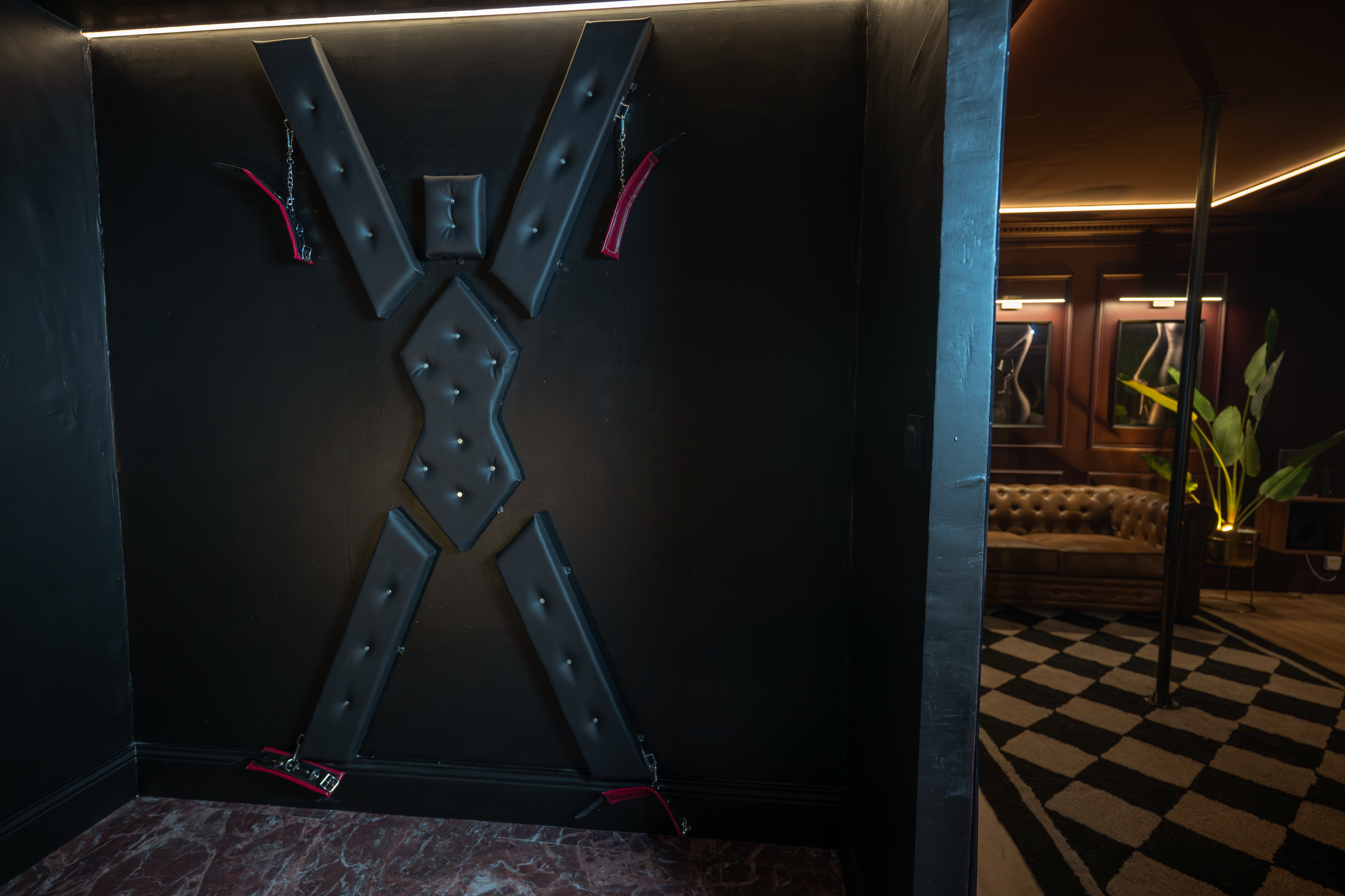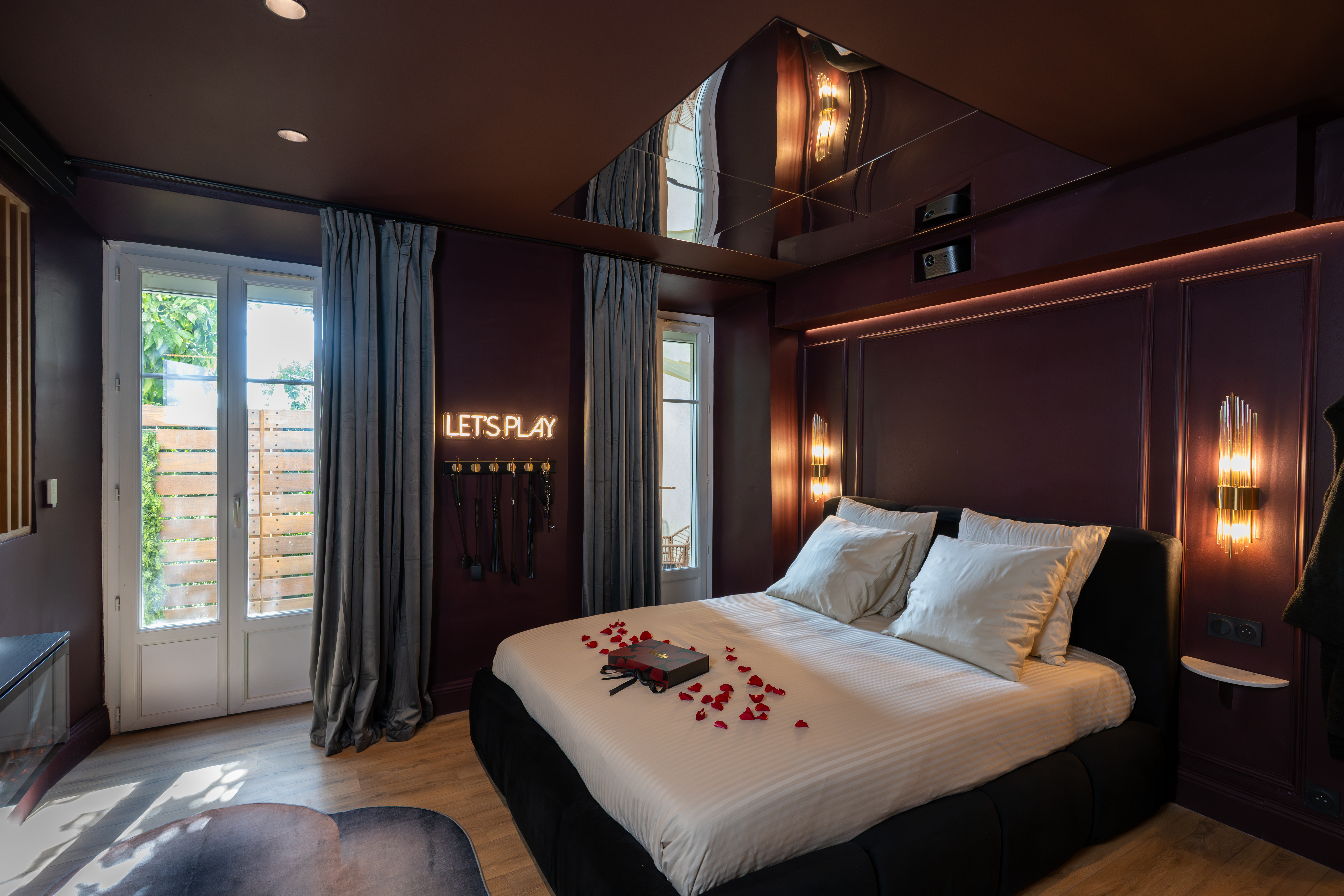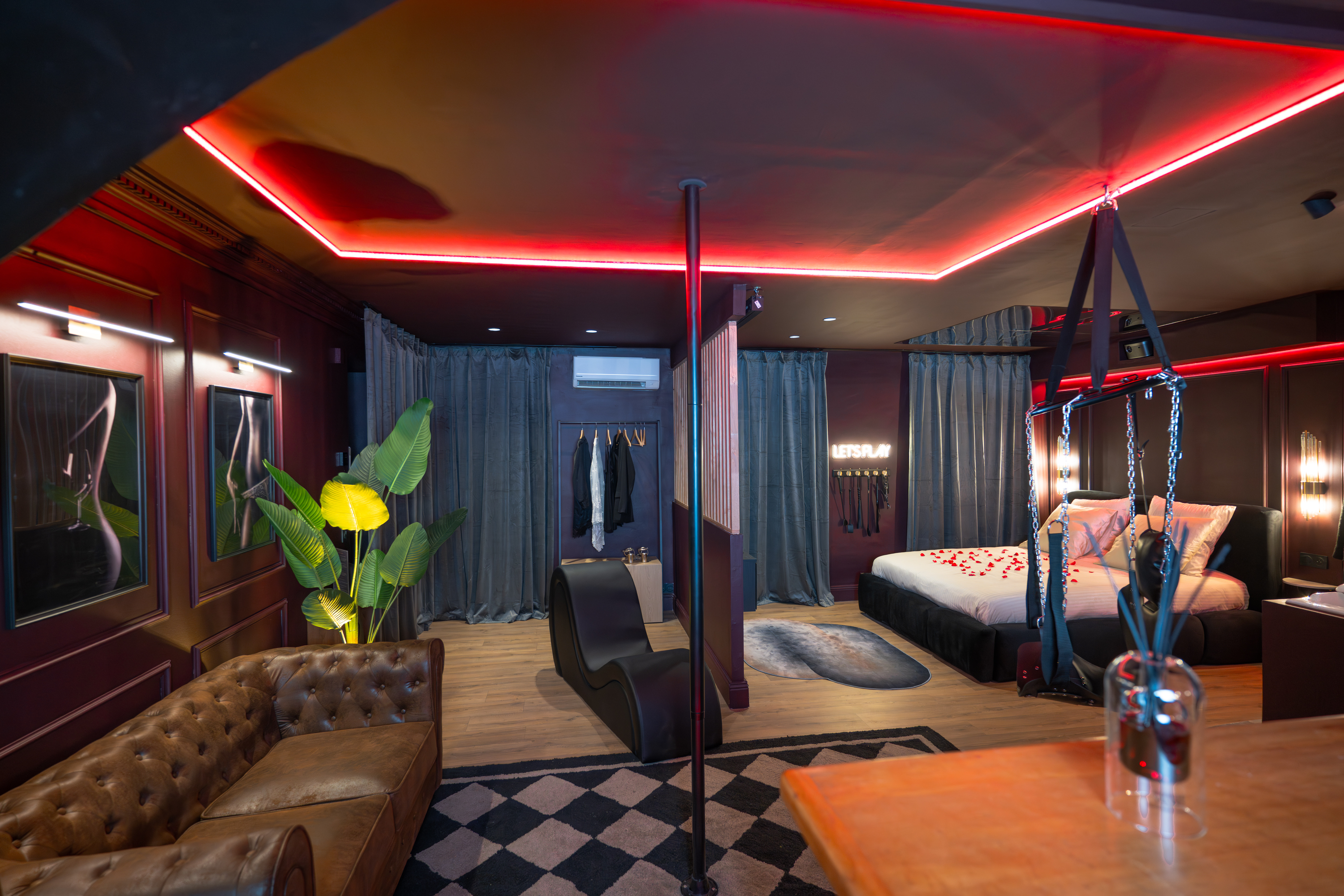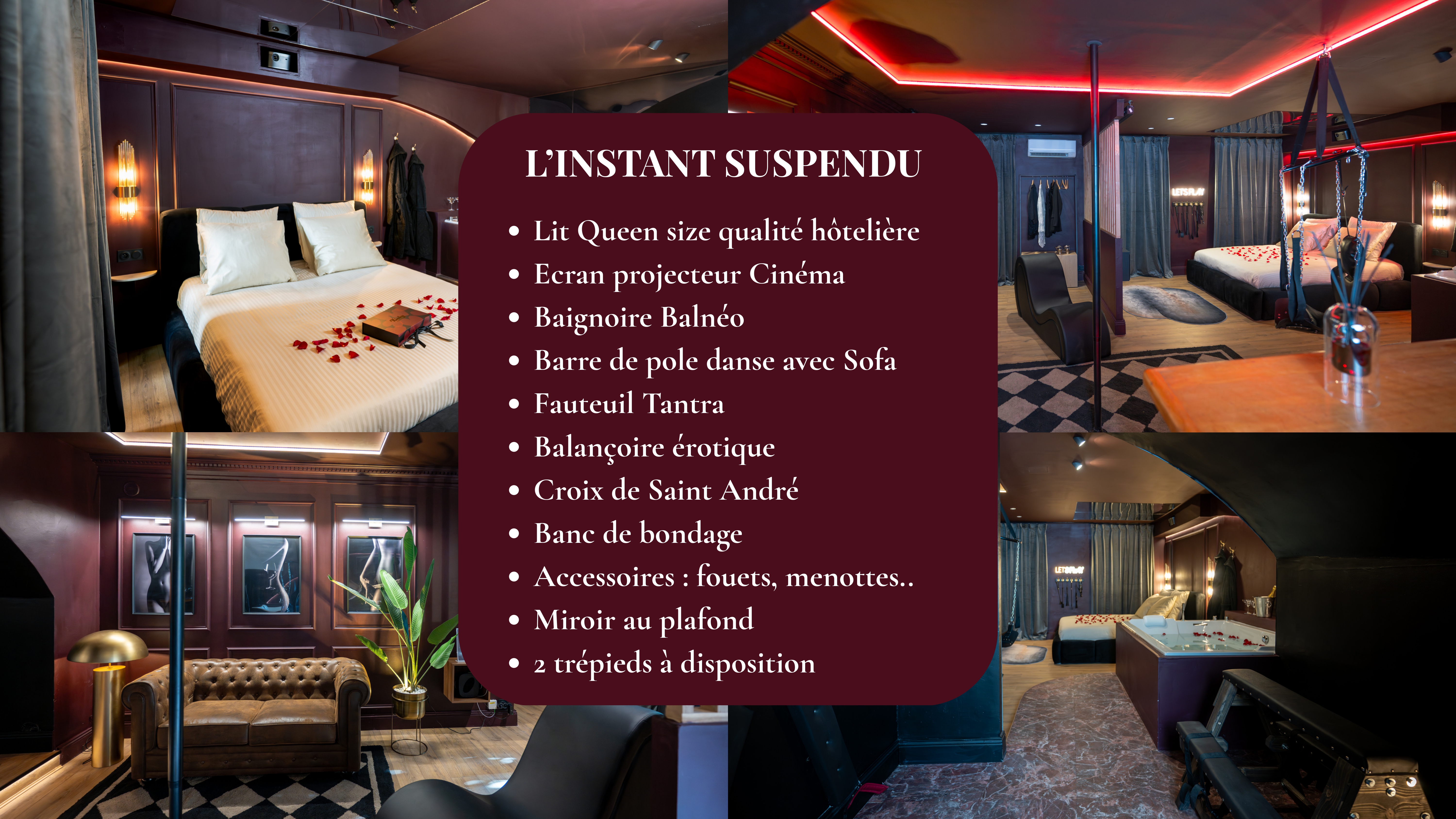 Baignoire balnéo, lit queen size, fauteuil tantra, croix de Saint-André, banc de bondage, barre de pole dance, miroir au plafond, balançoire érotique, accessoires...