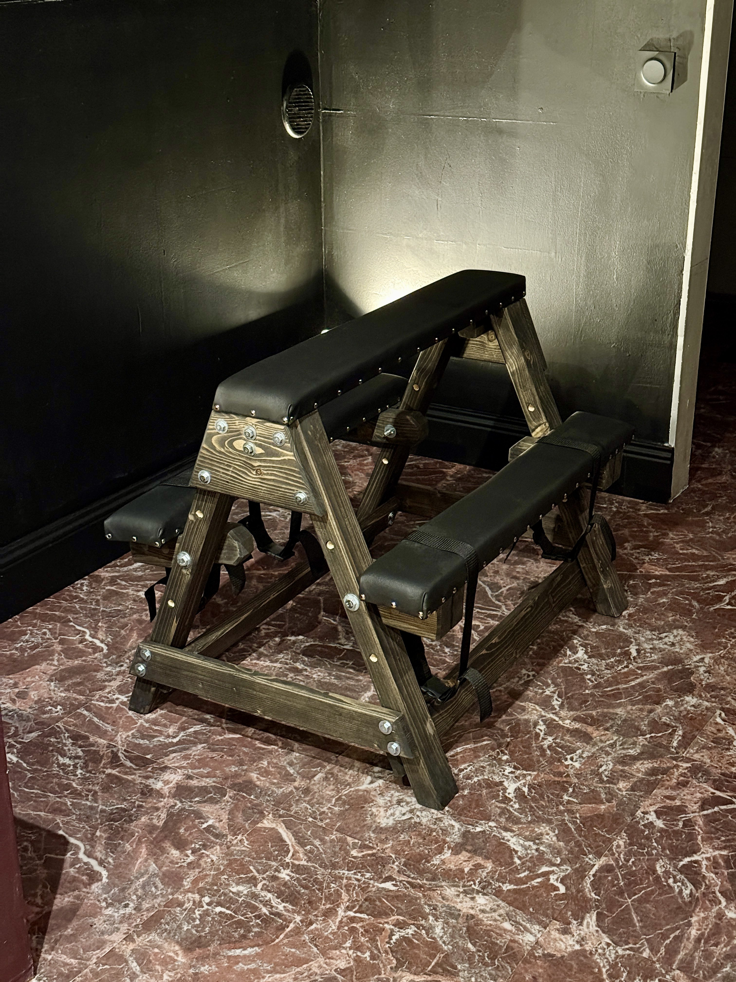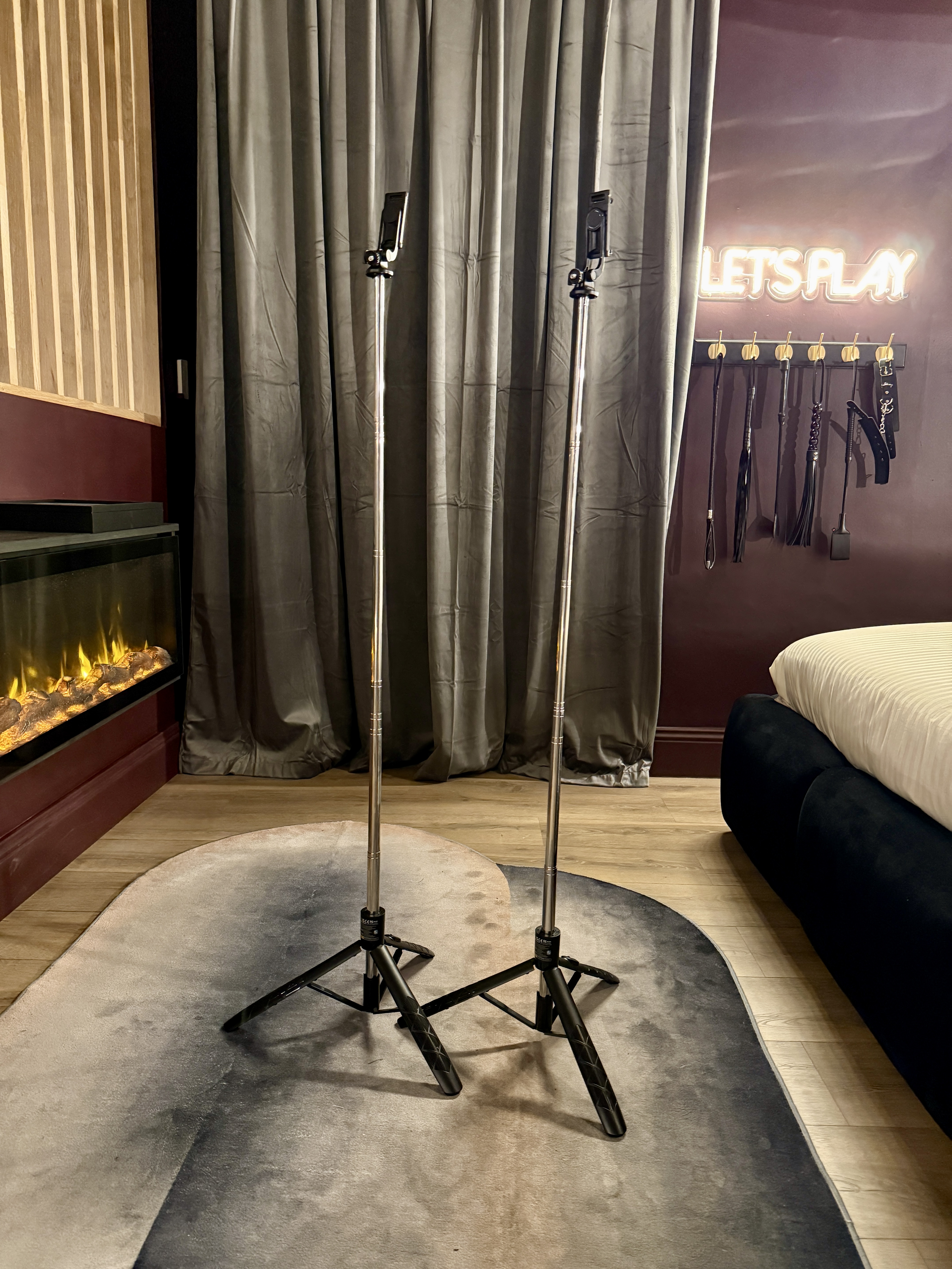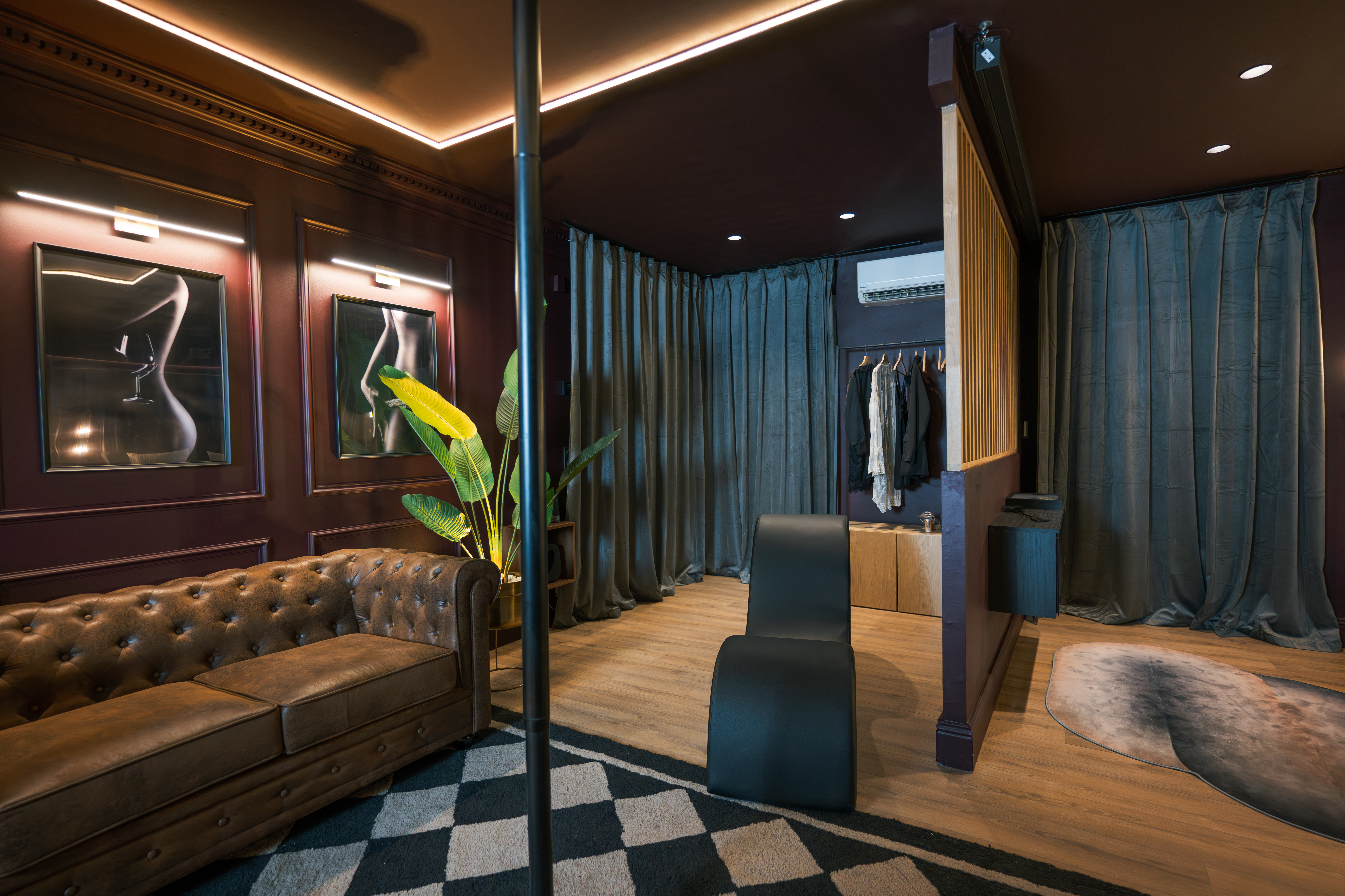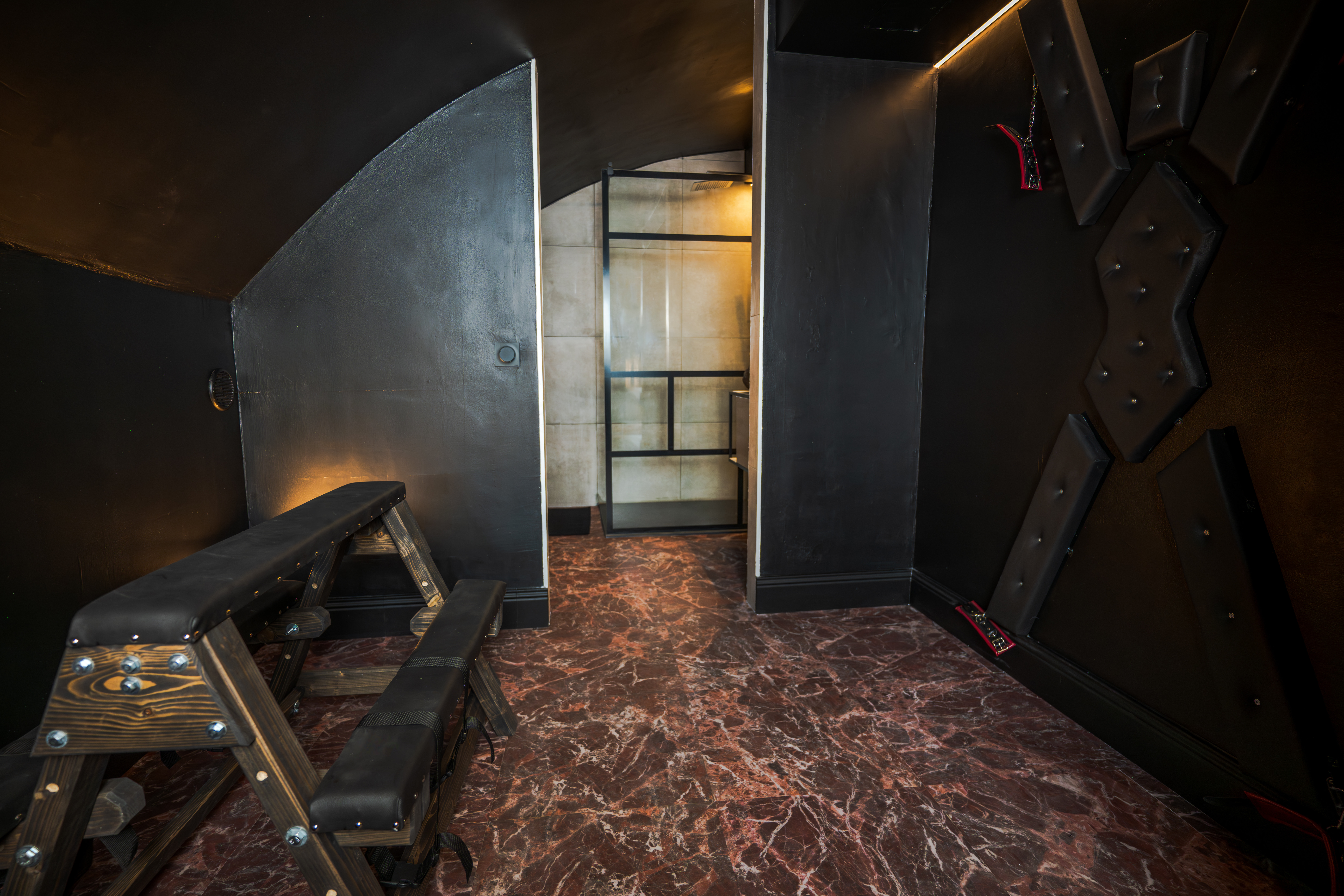 Baignoire balnéo, lit queen size, fauteuil tantra, croix de Saint-André, banc de bondage, barre de pole dance, miroir au plafond, balançoire érotique, accessoires...