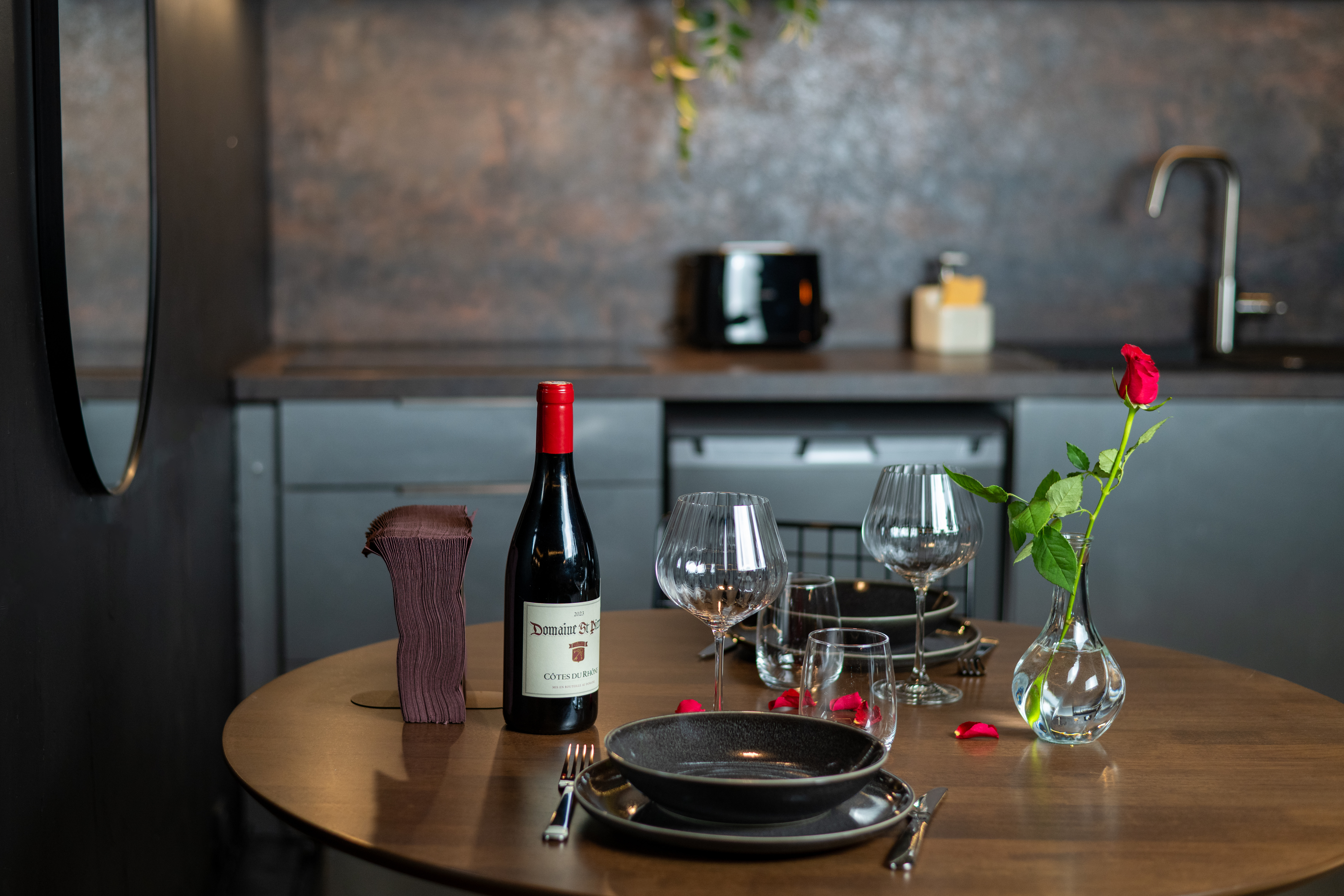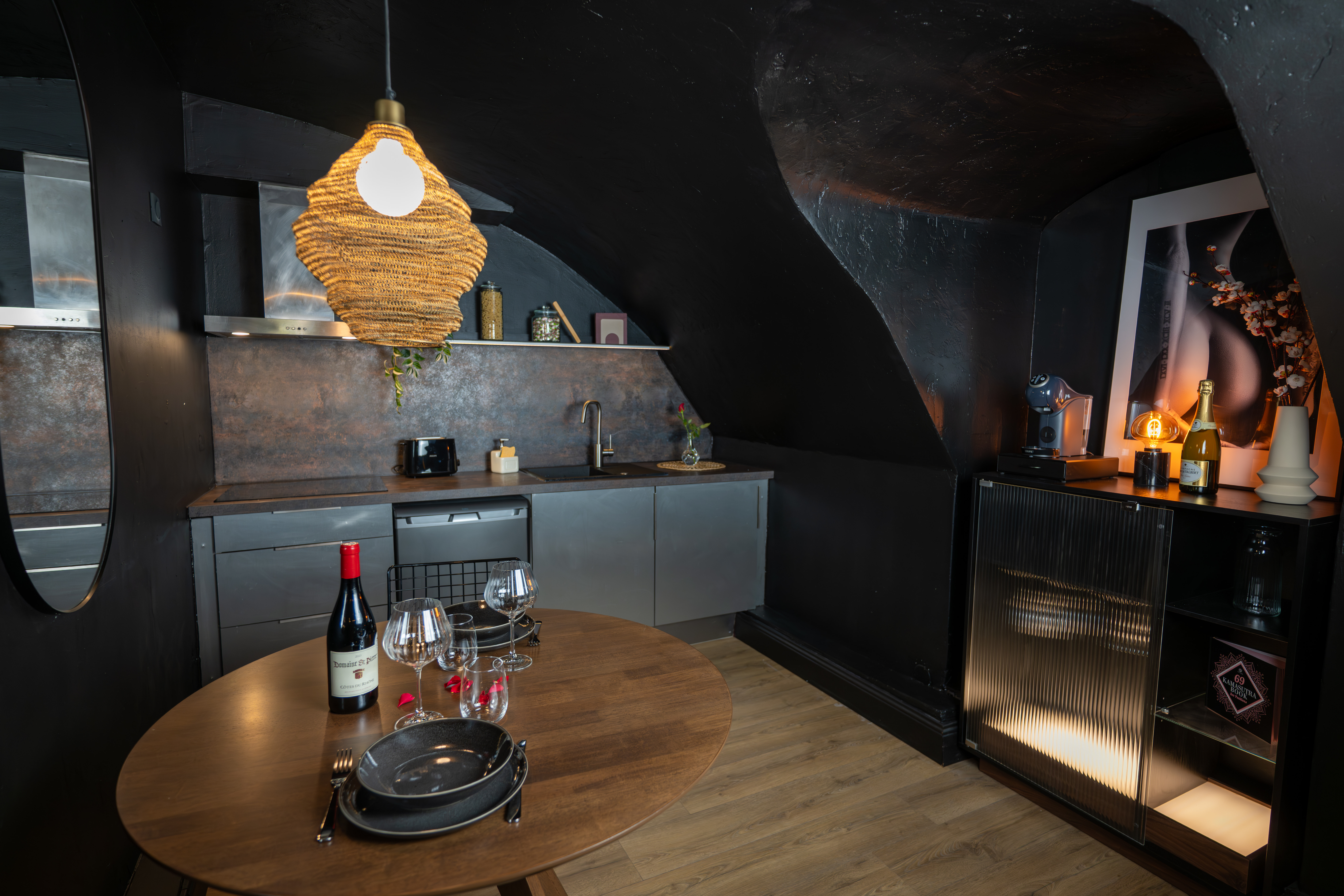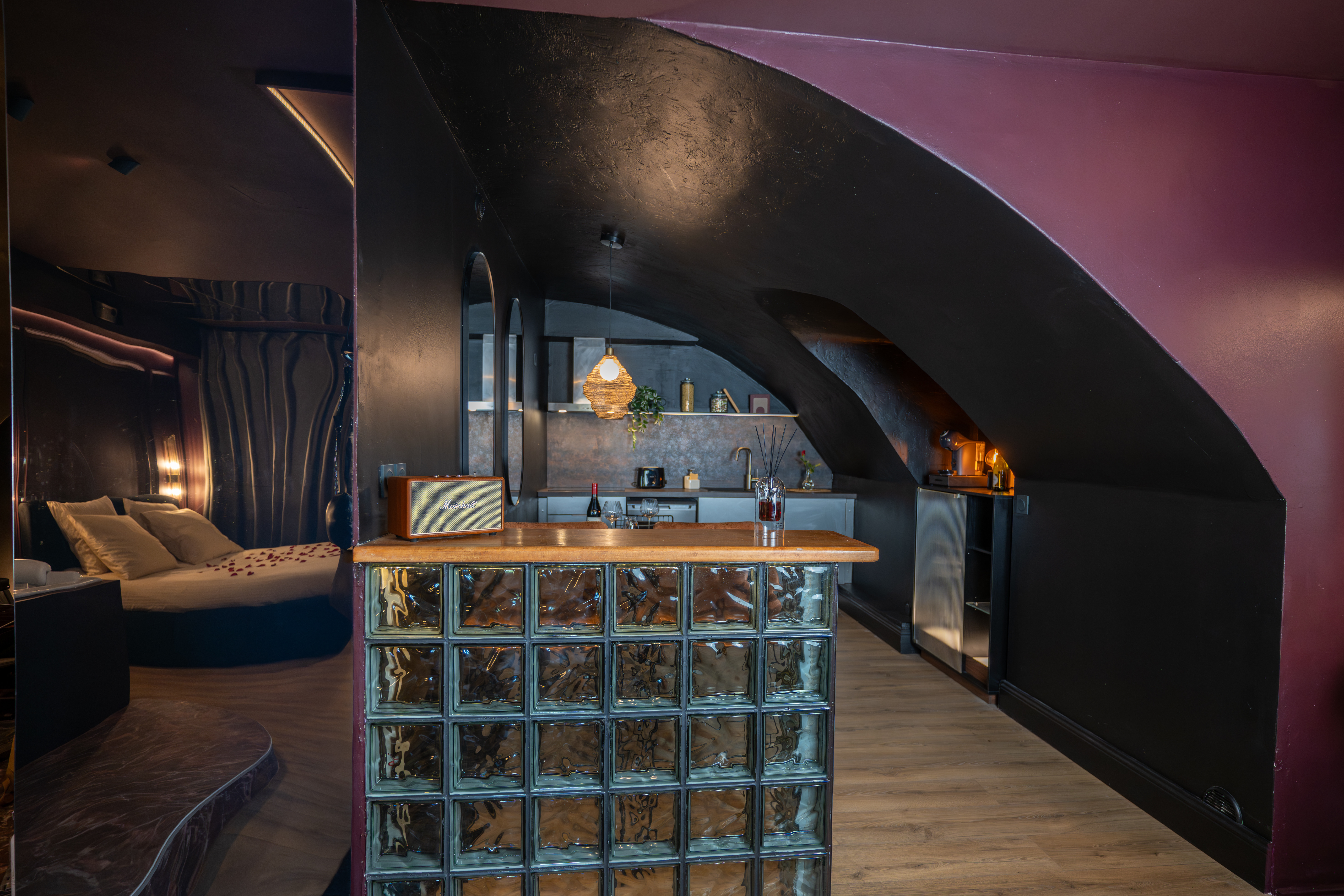 🌙 Ambiance lumineuse tamisée, minibar et coffret love en option.
