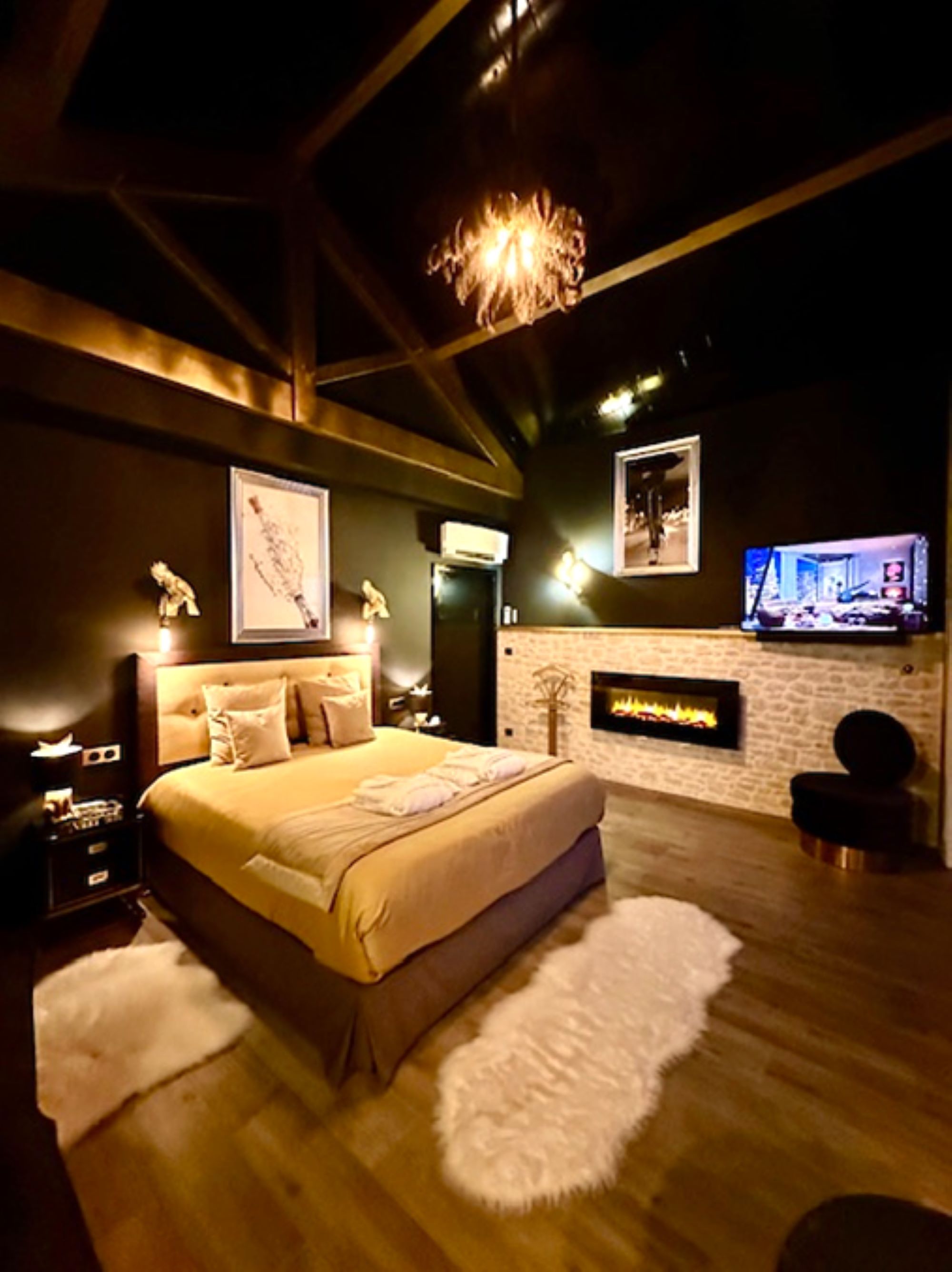 Pensé pour les couples en quête d’intimité et de raffinement, ce cocon glamour aux tons noir & or offre une atmosphère élégante, feutrée et chaleureuse.