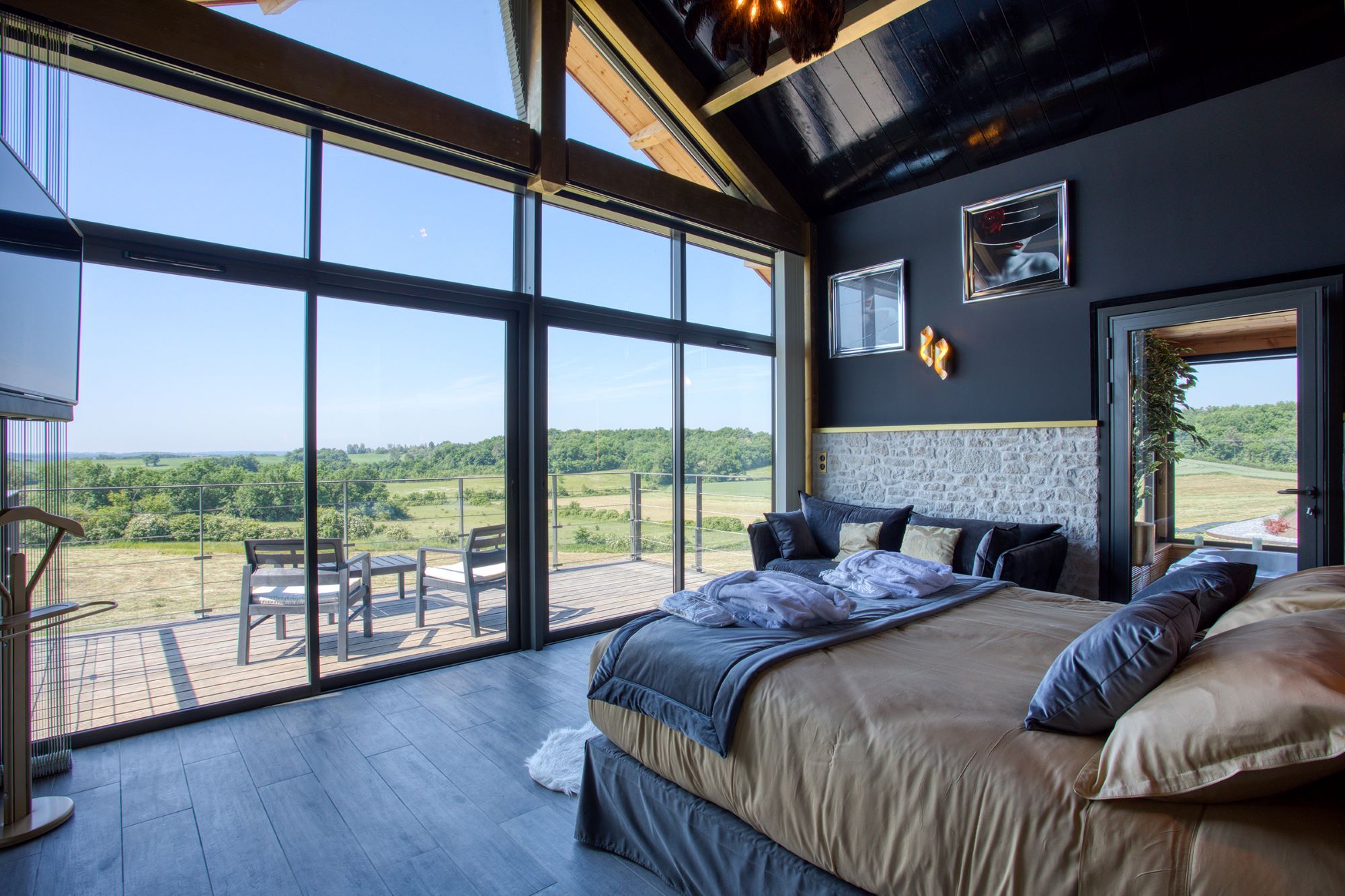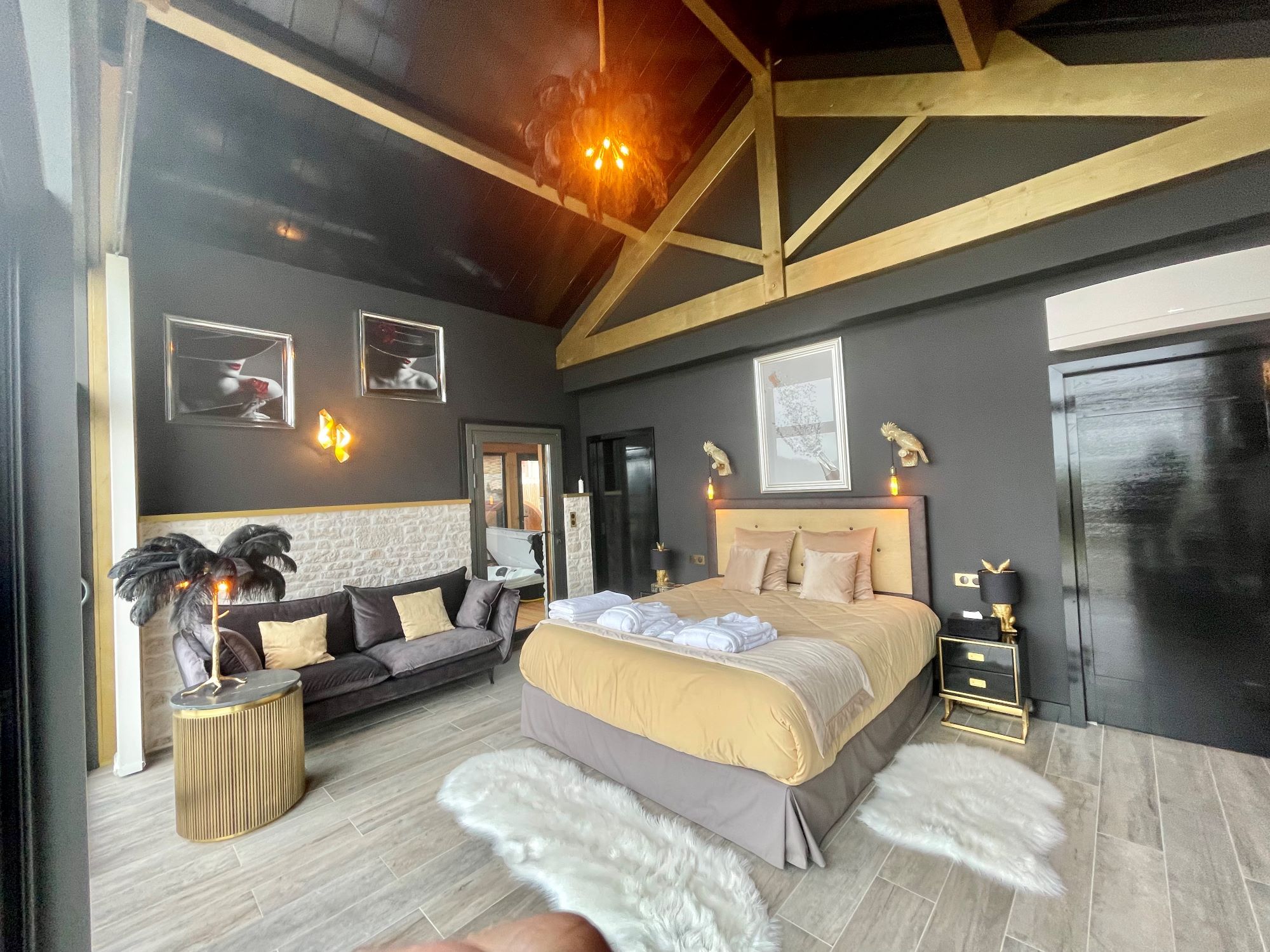 Pensé pour les couples en quête d’intimité et de raffinement, ce cocon glamour aux tons noir & or offre une atmosphère élégante, feutrée et chaleureuse. Ici, tout est entièrement privatif.
