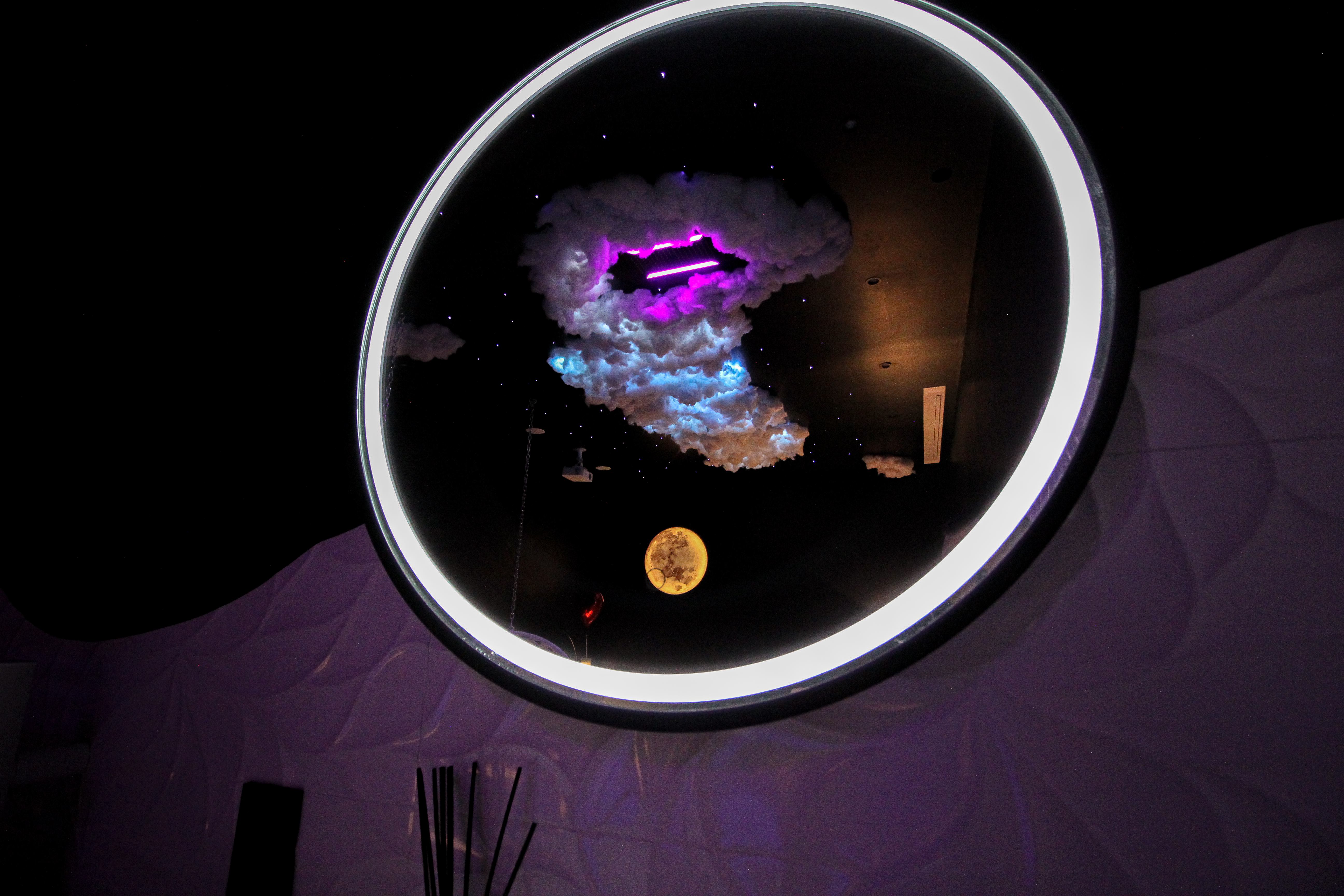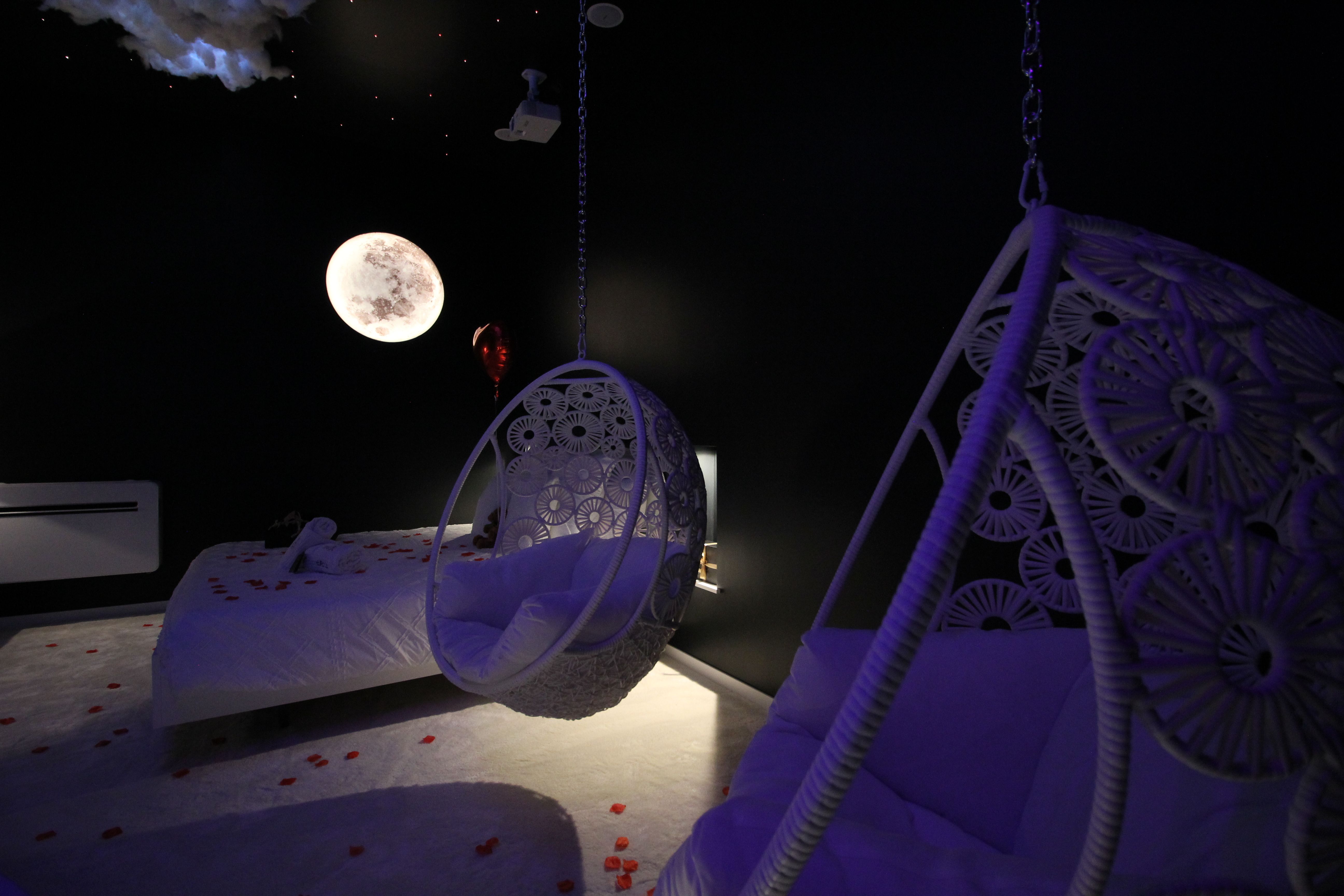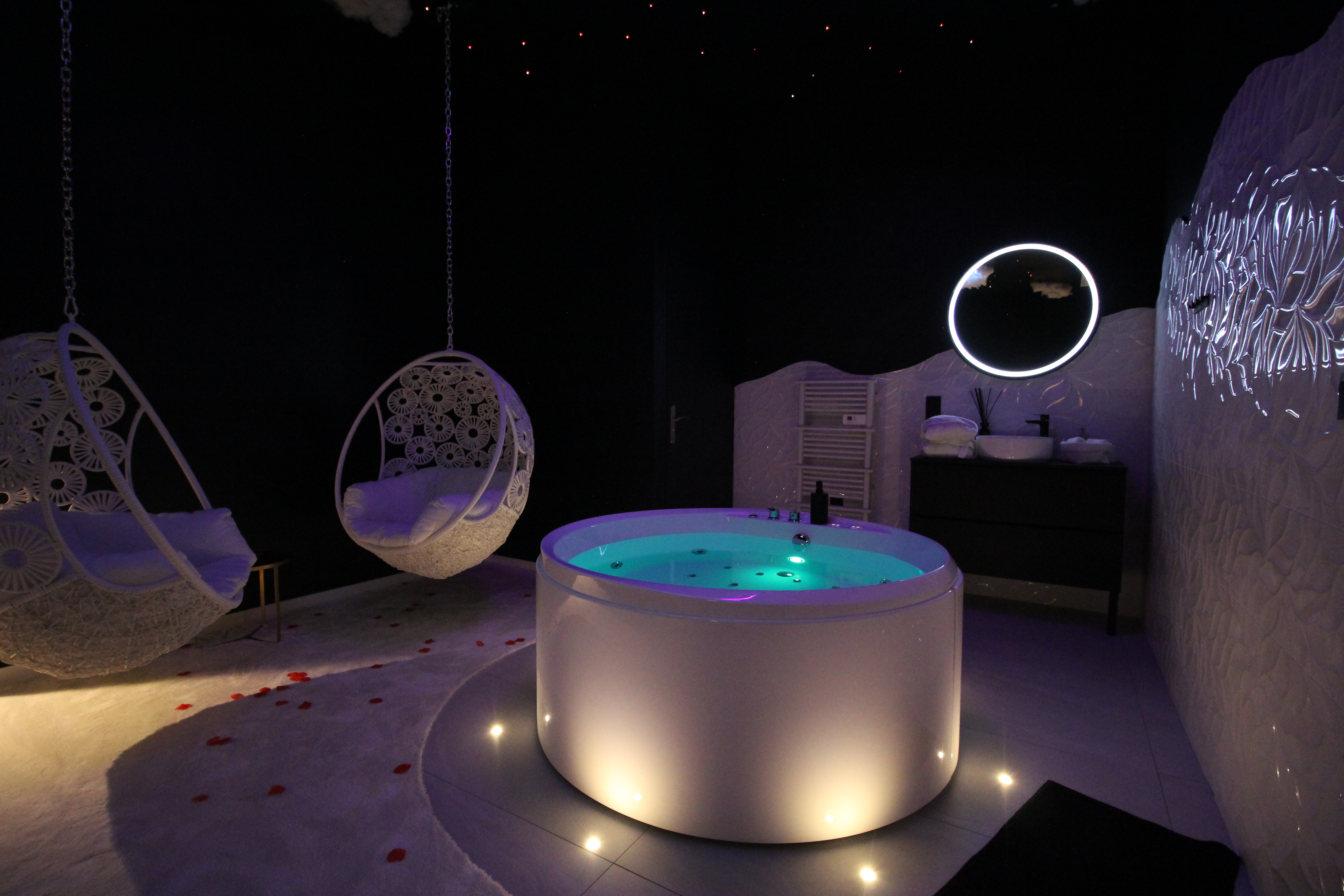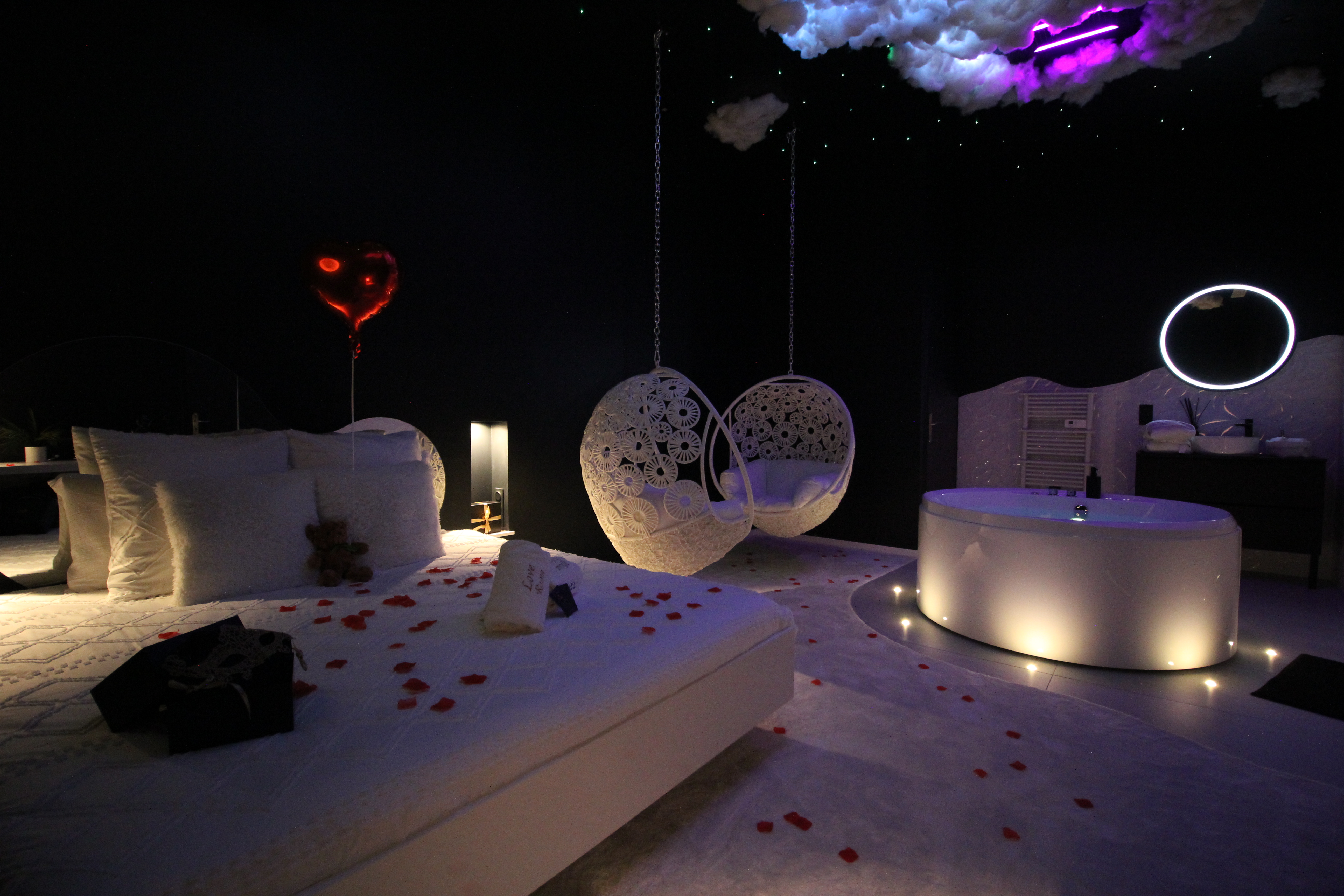 Inspirée de la légèreté et de la fluidité, cette love room mêle tons clairs, éclairages doux et ambiance enveloppante pour une expérience sensorielle unique. Espace nuit élégant avec :