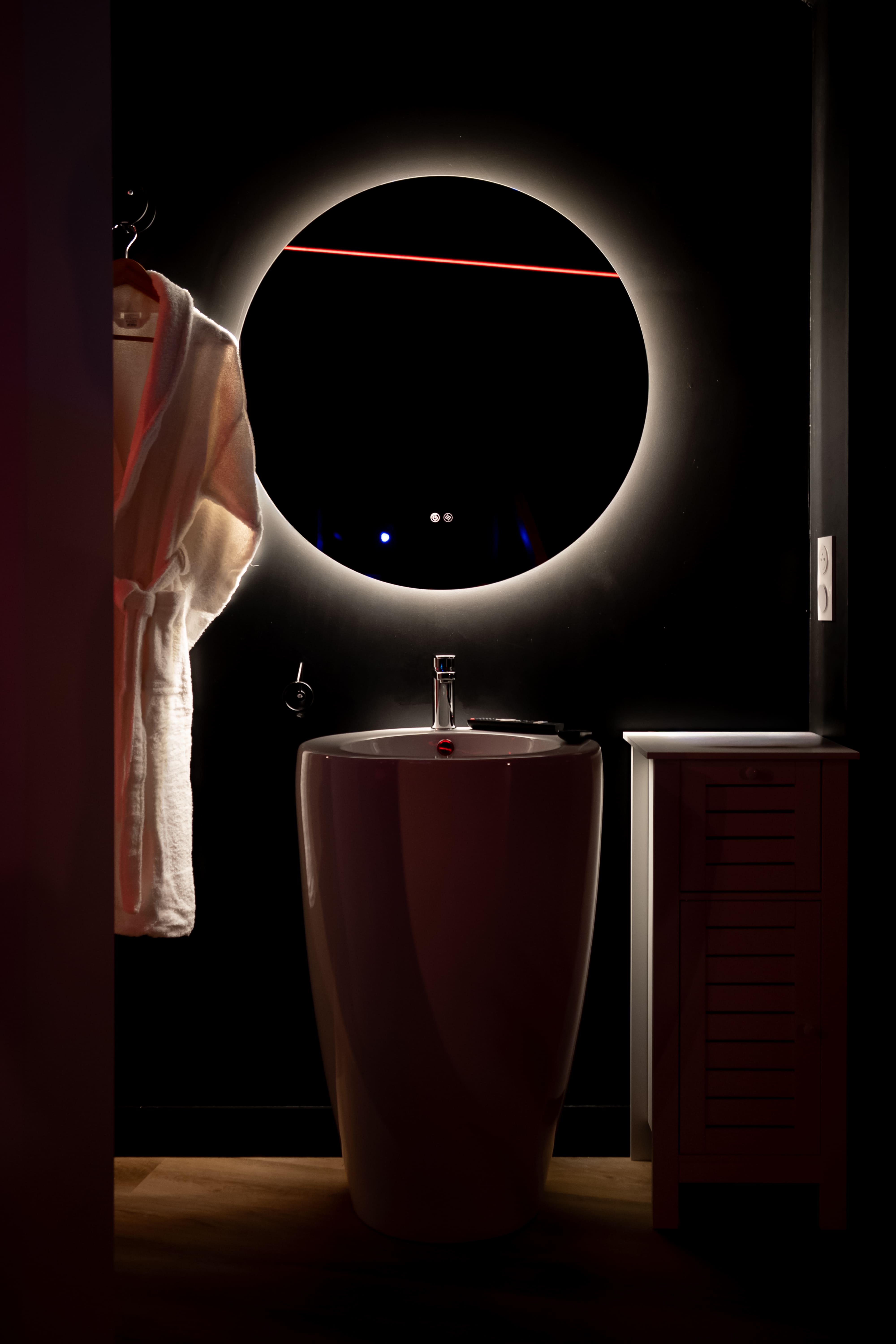 Dès votre arrivée, vous découvrez un lit rond majestueux, véritable pièce maîtresse de la suite, invitant à la détente et au lâcher-prise.