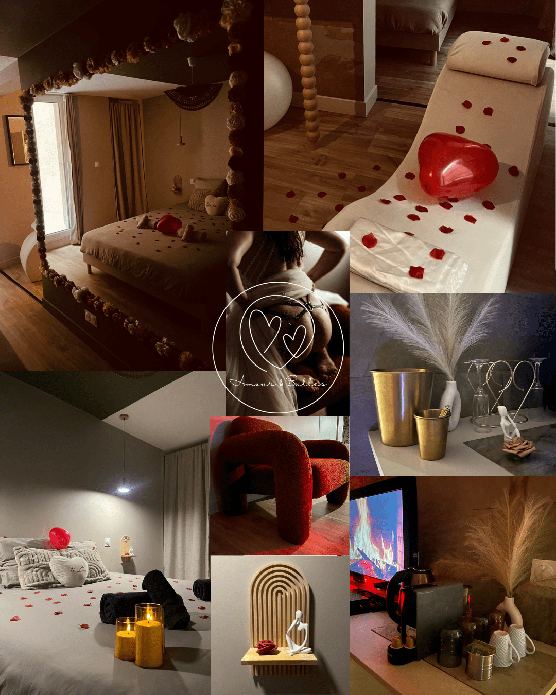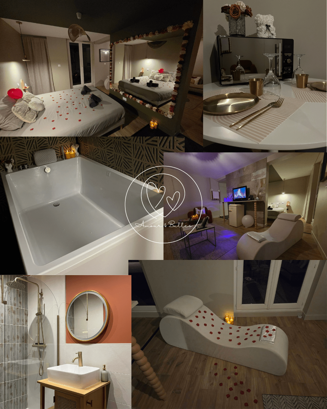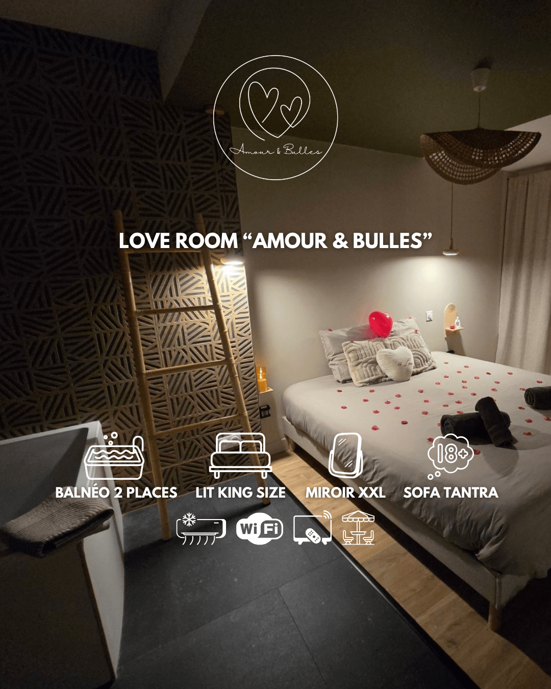 Amour & Bulles - Love room Valence Certaines adresses ne se racontent pas, elles se vivent. Amour & Bulles est une love room Valence confidentielle, pensée pour les couples qui souhaitent s’offrir une pause hors du temps, loin du quotidien, dans un cadre élégant, sensuel et apaisant. 🫧 Un espace bien-être pensé pour deux La balnéo 2 places devient le cœur de votre séjour. Ses jets hydromassants offrent un moment de relaxation absolue, idéal pour relâcher les tensions et savourer un instant de bien-être partagé. À deux, dans une eau chaude et apaisante, le temps semble suspendu. 🛏️ Des nuits inoubliables Le lit king size 180 cm, habillé d’une literie haut de gamme, garantit un confort exceptionnel. Généreux, accueillant et élégant, il vous invite aussi bien au repos qu’à la passion. Chaque nuit passée à Amour & Bulles devient un souvenir à part entière. 🛋️ Une touche audacieuse et assumée Pour celles et ceux qui souhaitent explorer une expérience différente, le sofa Tantra apporte une dimension sensuelle et ludique à votre séjour. Associé au miroir XXL, il enrichit l’expérience sans jamais perdre en élégance ni en subtilité. 🍾 Des attentions pour sublimer votre escapade Afin de personnaliser votre séjour, des options romantiques et sensuelles sont proposées : pétales de rose, ballons cœur, bouteille de Prosecco, petites attentions soigneusement sélectionnées. Vous composez ainsi une expérience sur mesure, selon vos envies. 🚿 Confort, propreté et discrétion La salle d’eau moderne, parfaitement équipée, reflète l’exigence du lieu : propreté irréprochable, linge de qualité hôtelière et équipements soignés. Le confort moderne (Wi-Fi, télévision, climatisation, chauffage) complète l’expérience pour un séjour fluide et serein. 📍 Un emplacement idéal à Valence Située à quelques minutes à pied du centre-ville de Valence, Amour & Bulles bénéficie d’un emplacement pratique tout en conservant une parfaite discrétion. Cour privée et parking public à proximité facilitent votre arrivée en toute tranquillité. Amour & Bulles s’adresse aux couples en quête d’émotions, de détente et de moments partagés.