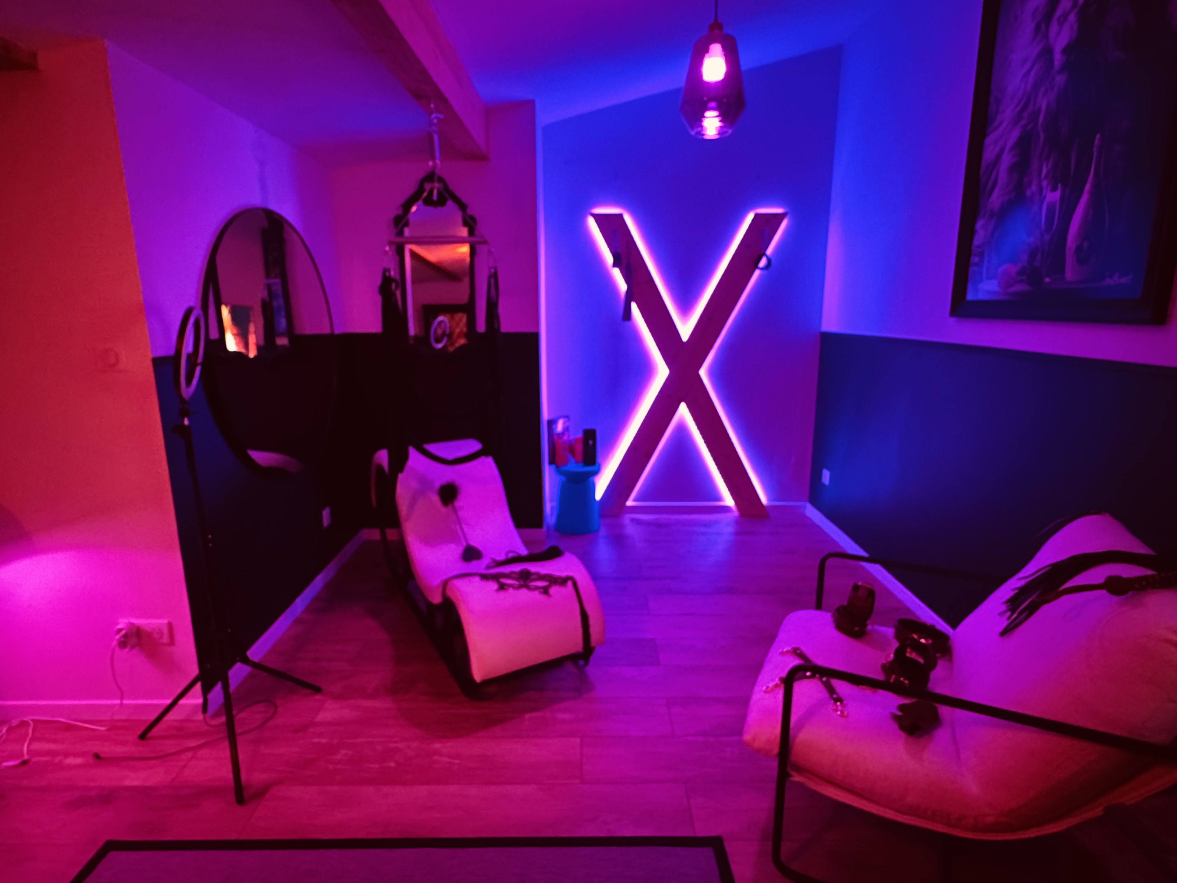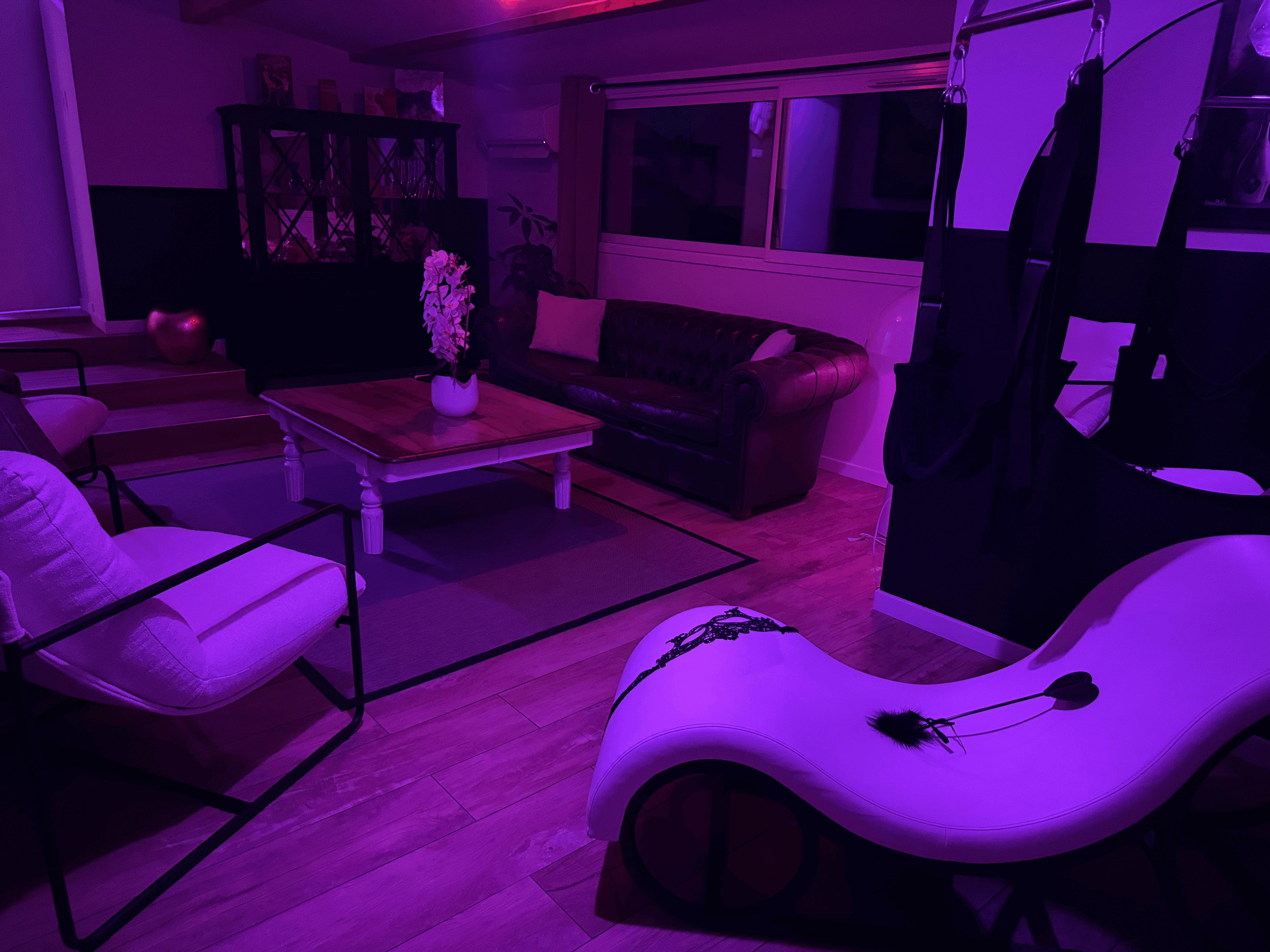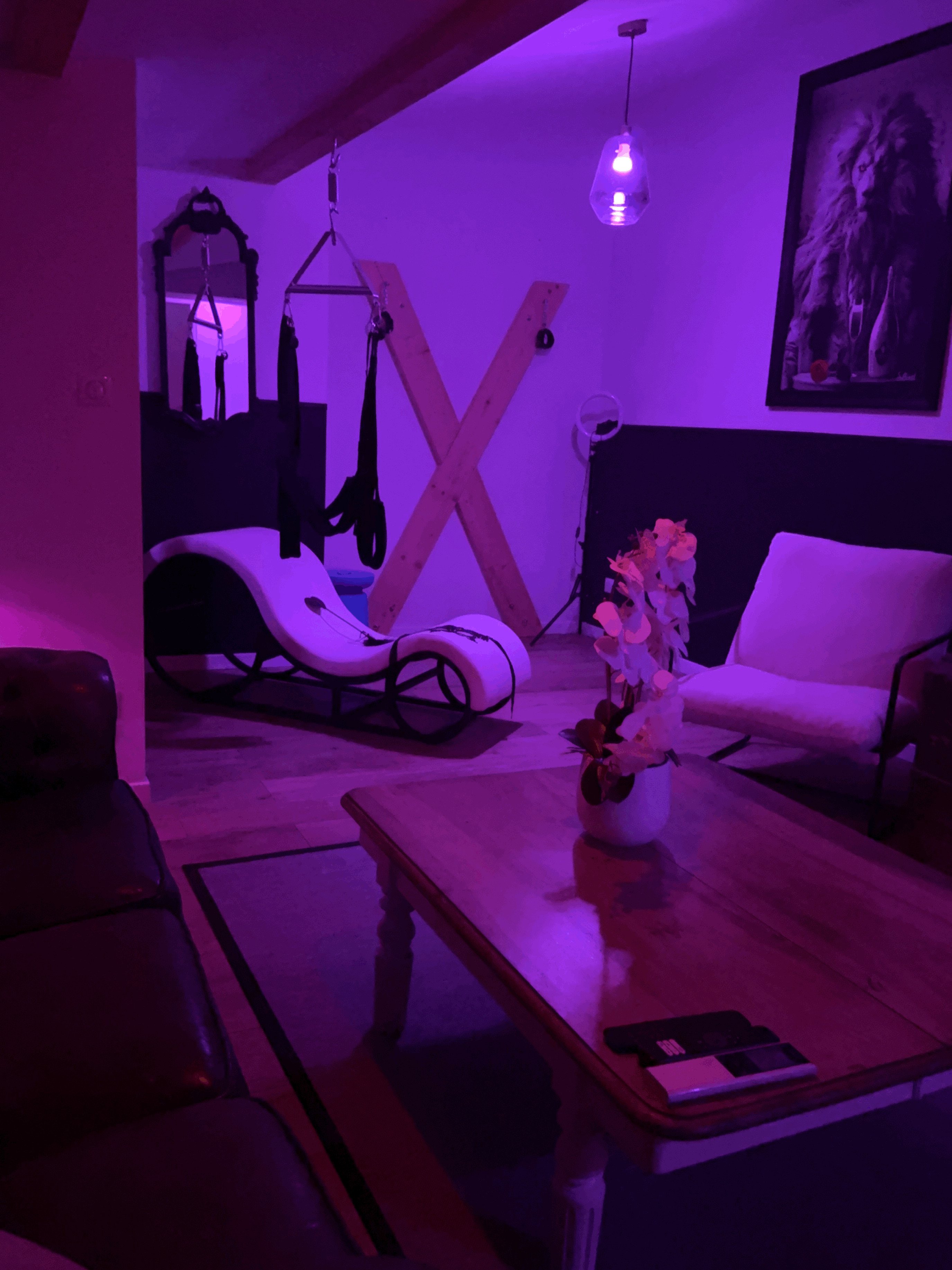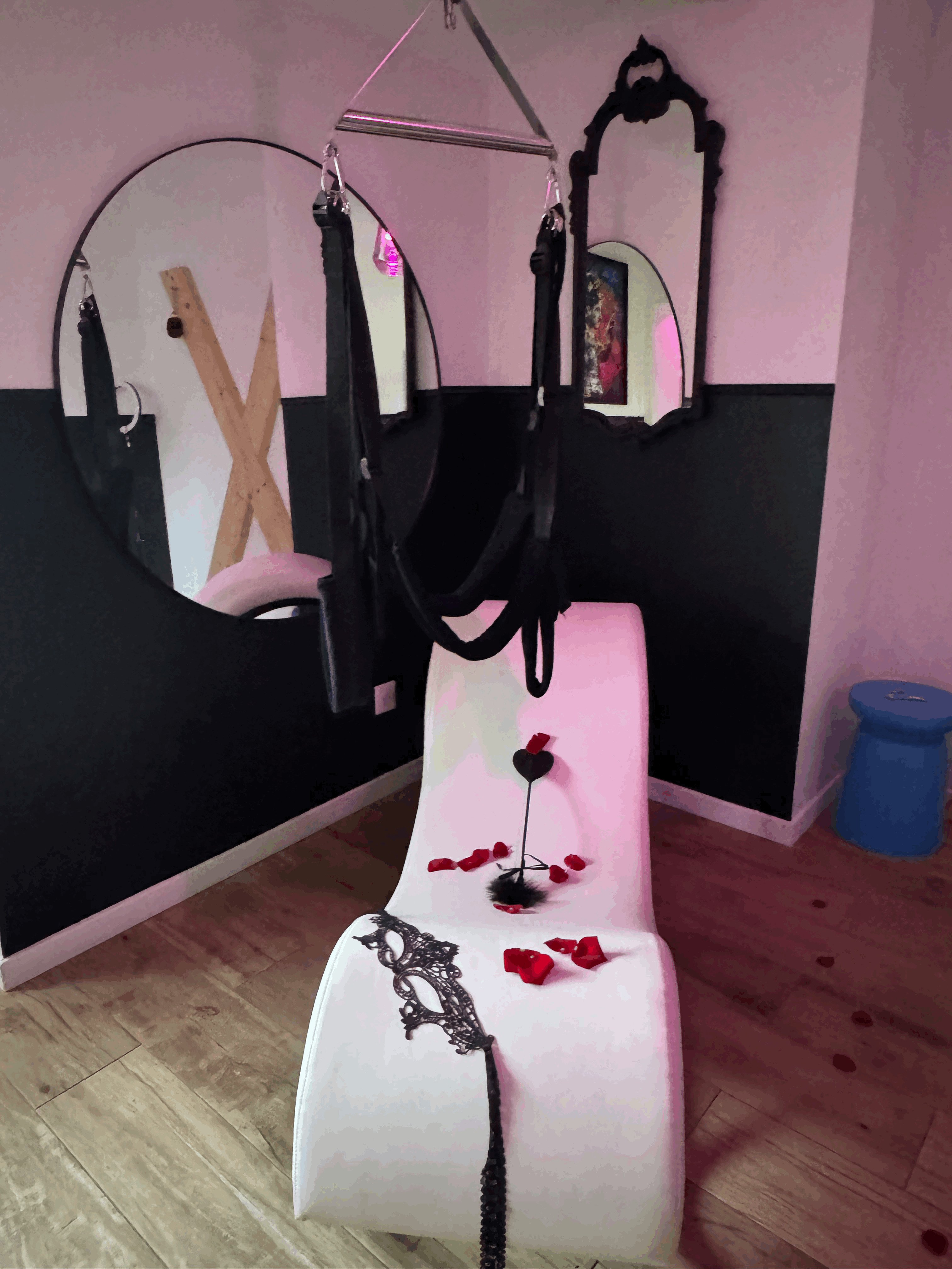 Envie de pimenter la soirée ? Découvrez l’espace coquin inclus avec balançoire érotique, croix de Saint-André, fauteuil tantra, miroirs sur les murs ainsi qu'au plafond et jeux de lumière connectés.