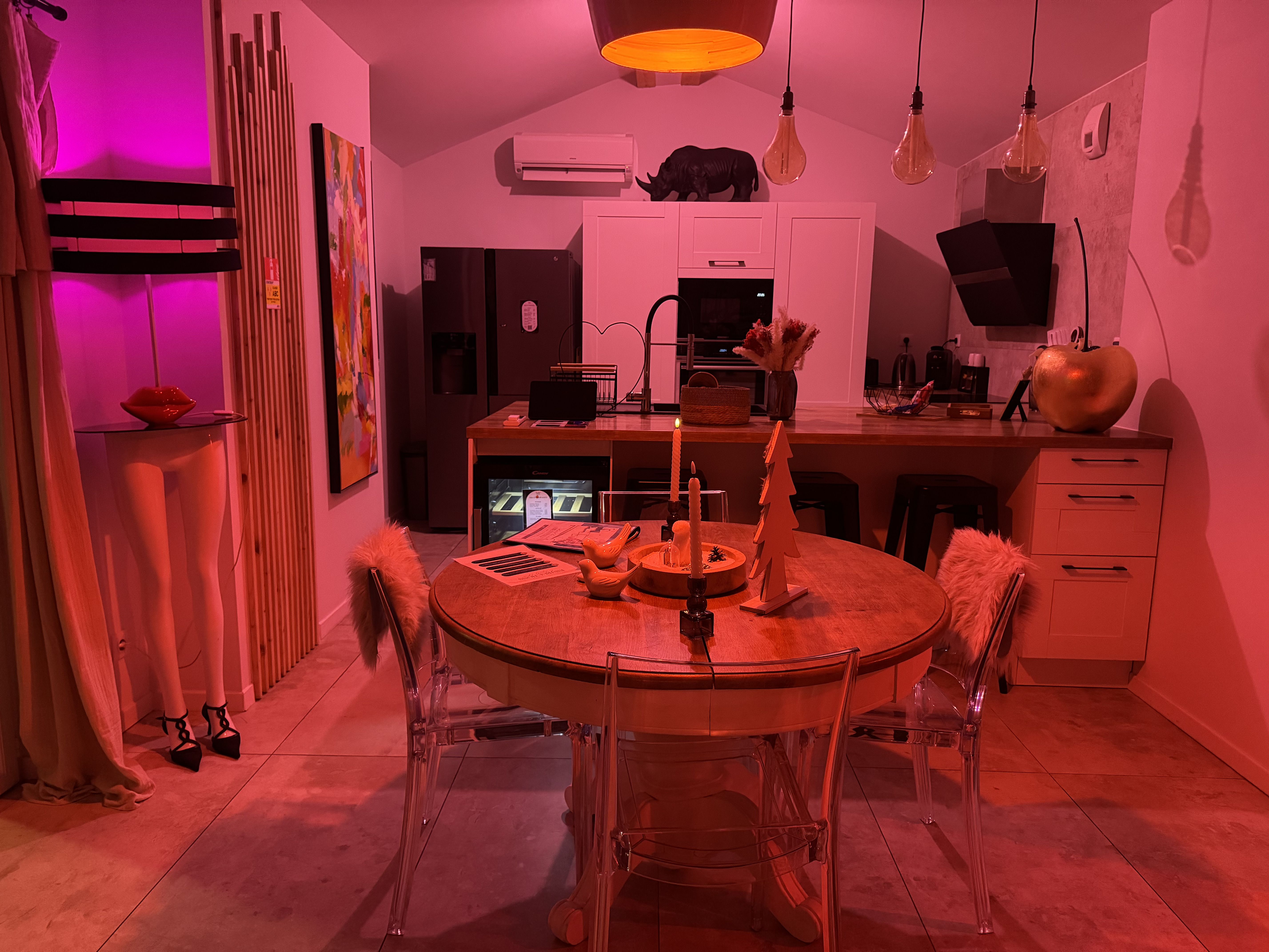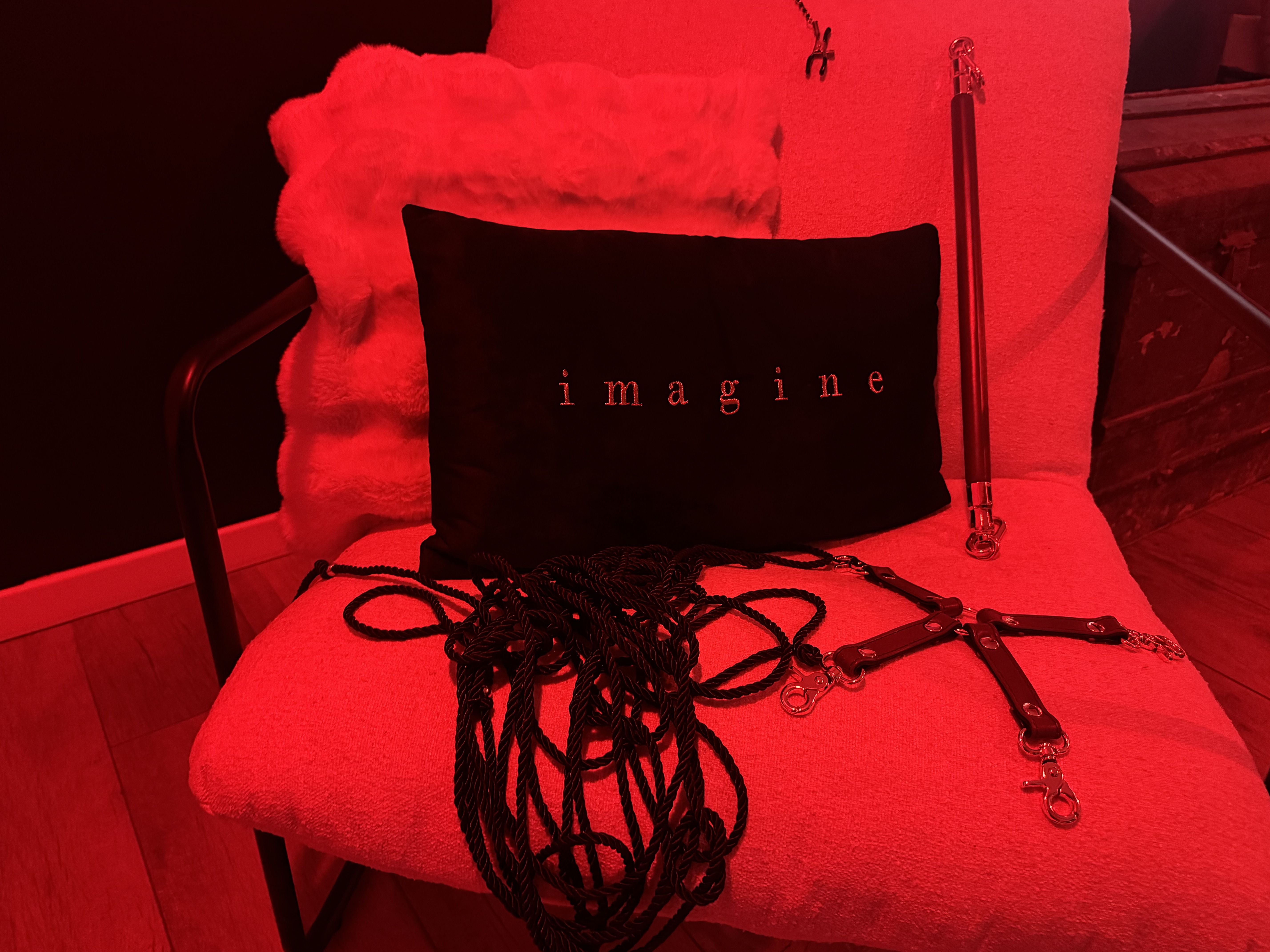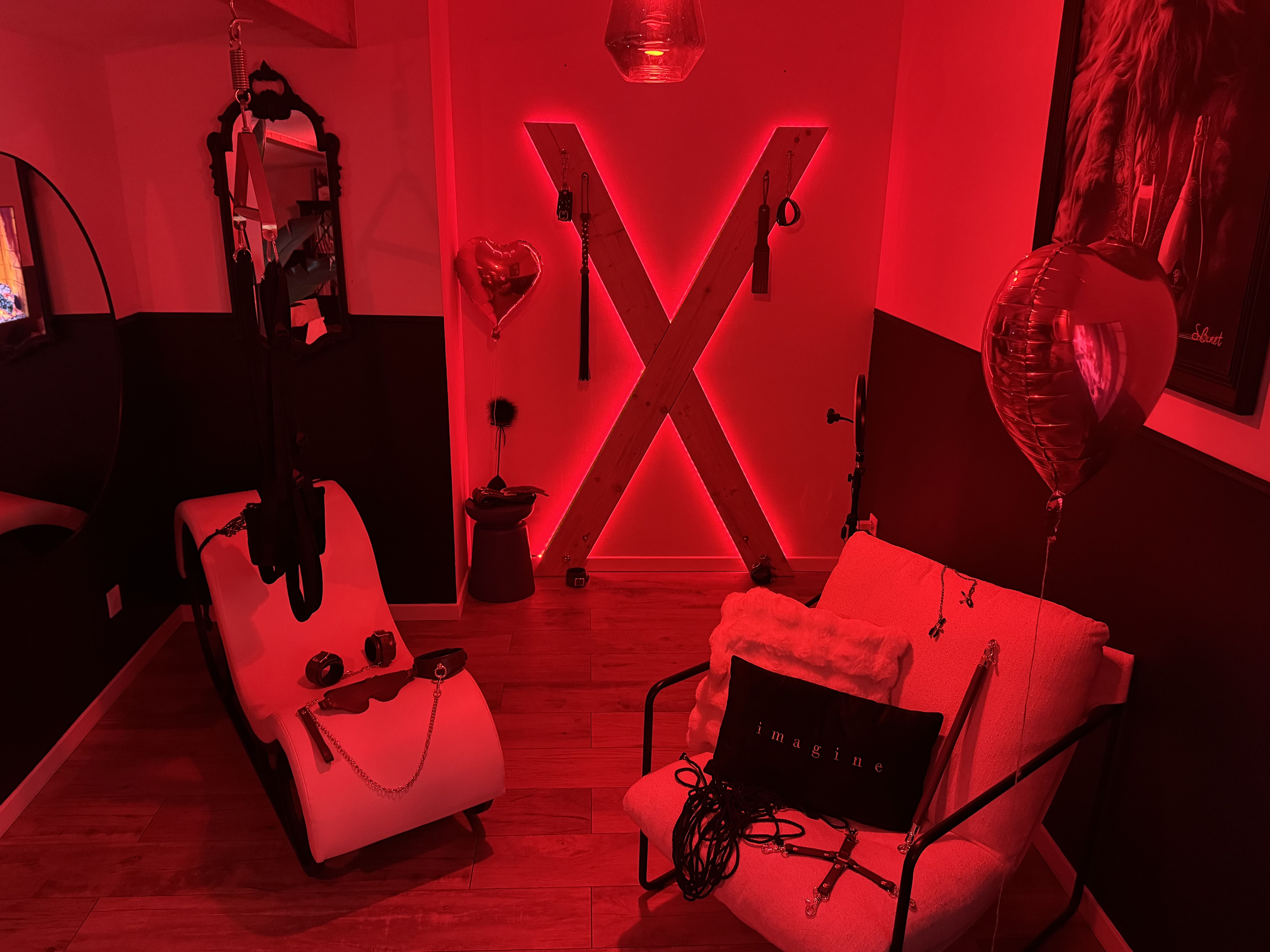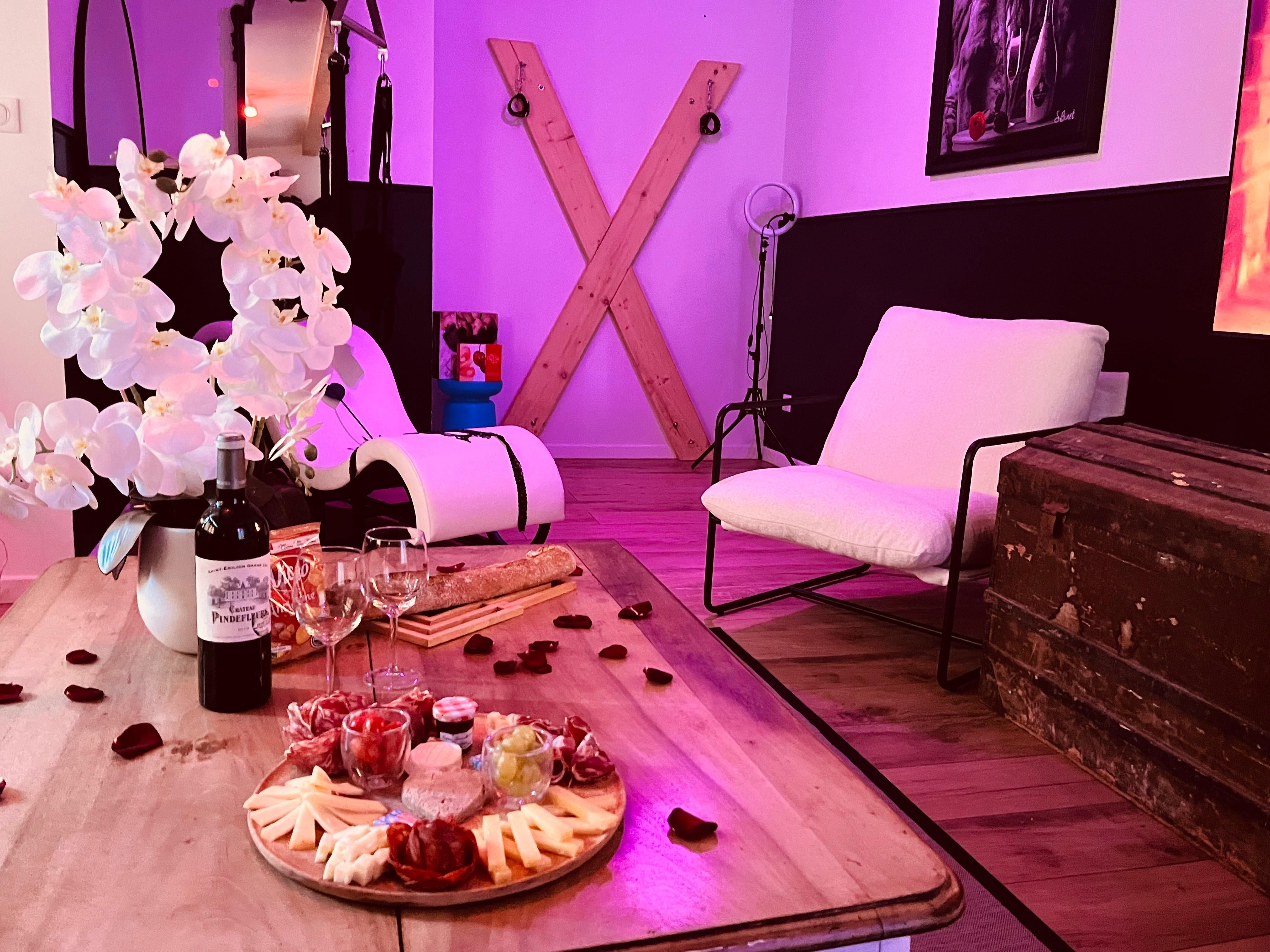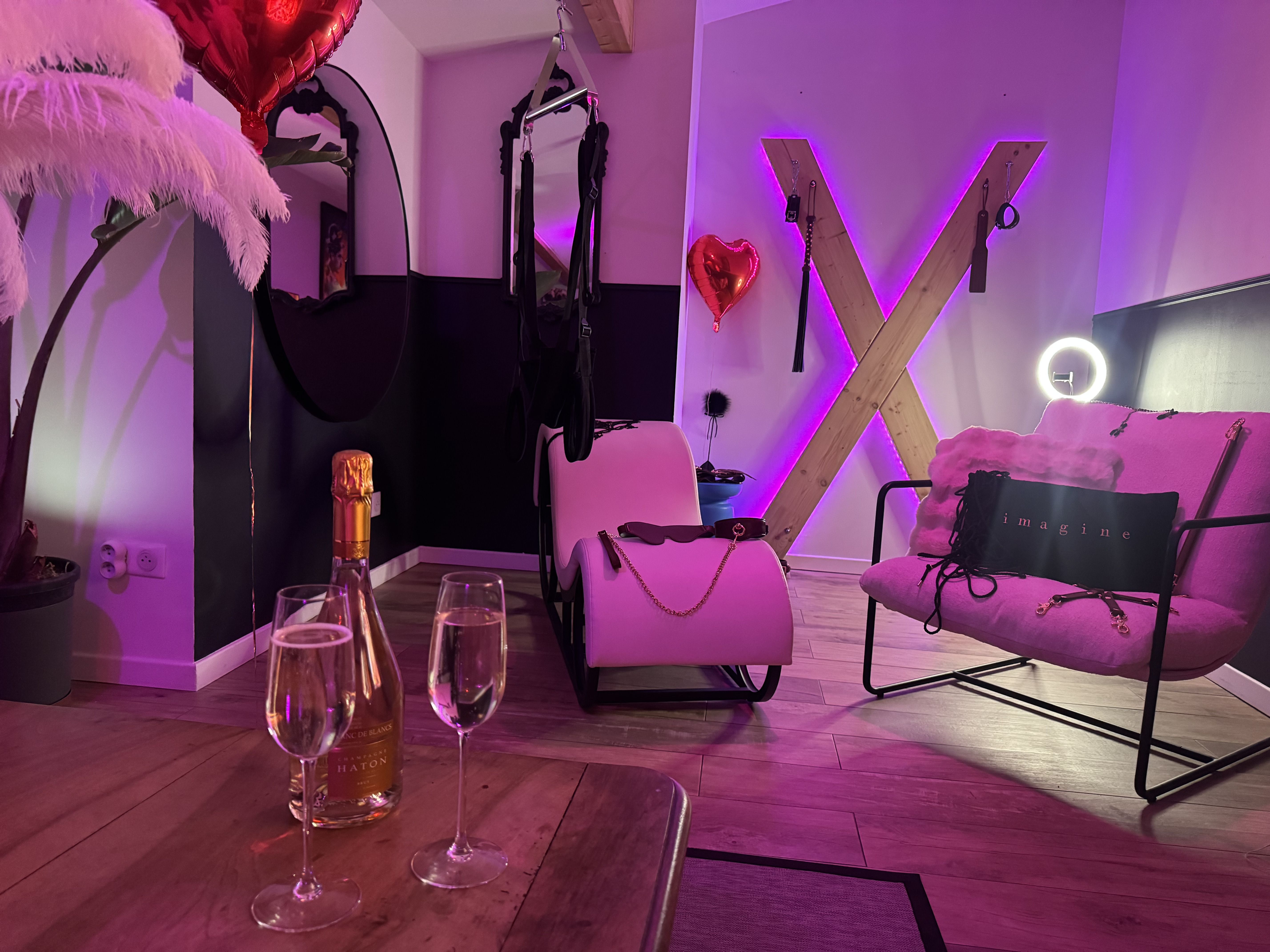 Envie de pimenter la soirée ? Découvrez l’espace coquin inclus avec balançoire érotique, croix de Saint-André, fauteuil tantra, miroirs sur les murs ainsi qu'au plafond et jeux de lumière connectés.
