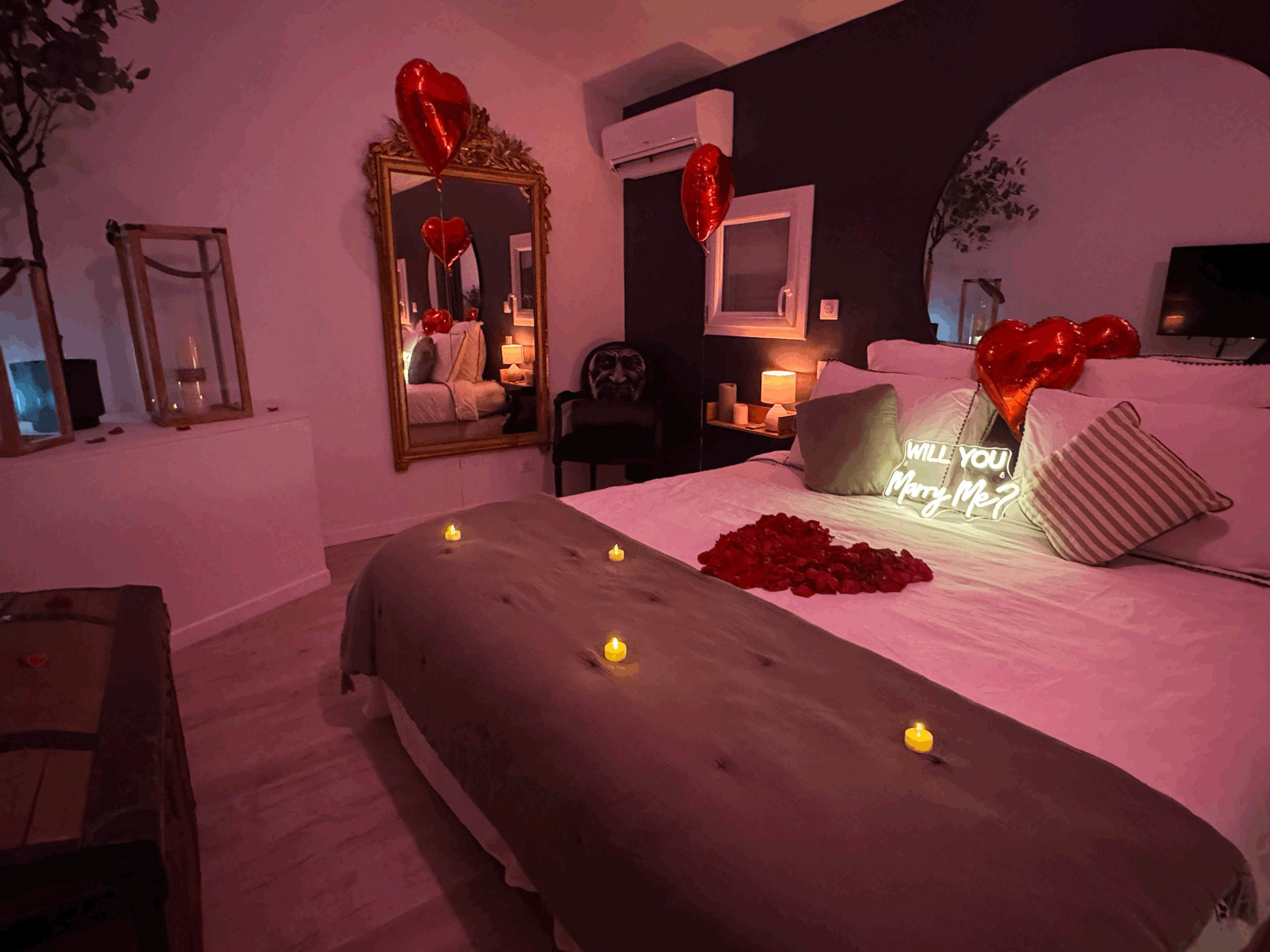 Côté confort, la maison dispose de deux chambres (lit king size et queen size), d’une cuisine équipée, et d’une décoration raffinée pensée pour la complicité. Personnalisez votre séjour avec nos options romantiques : pétales de roses, ballons, bouquet ou bouteille de champagne.