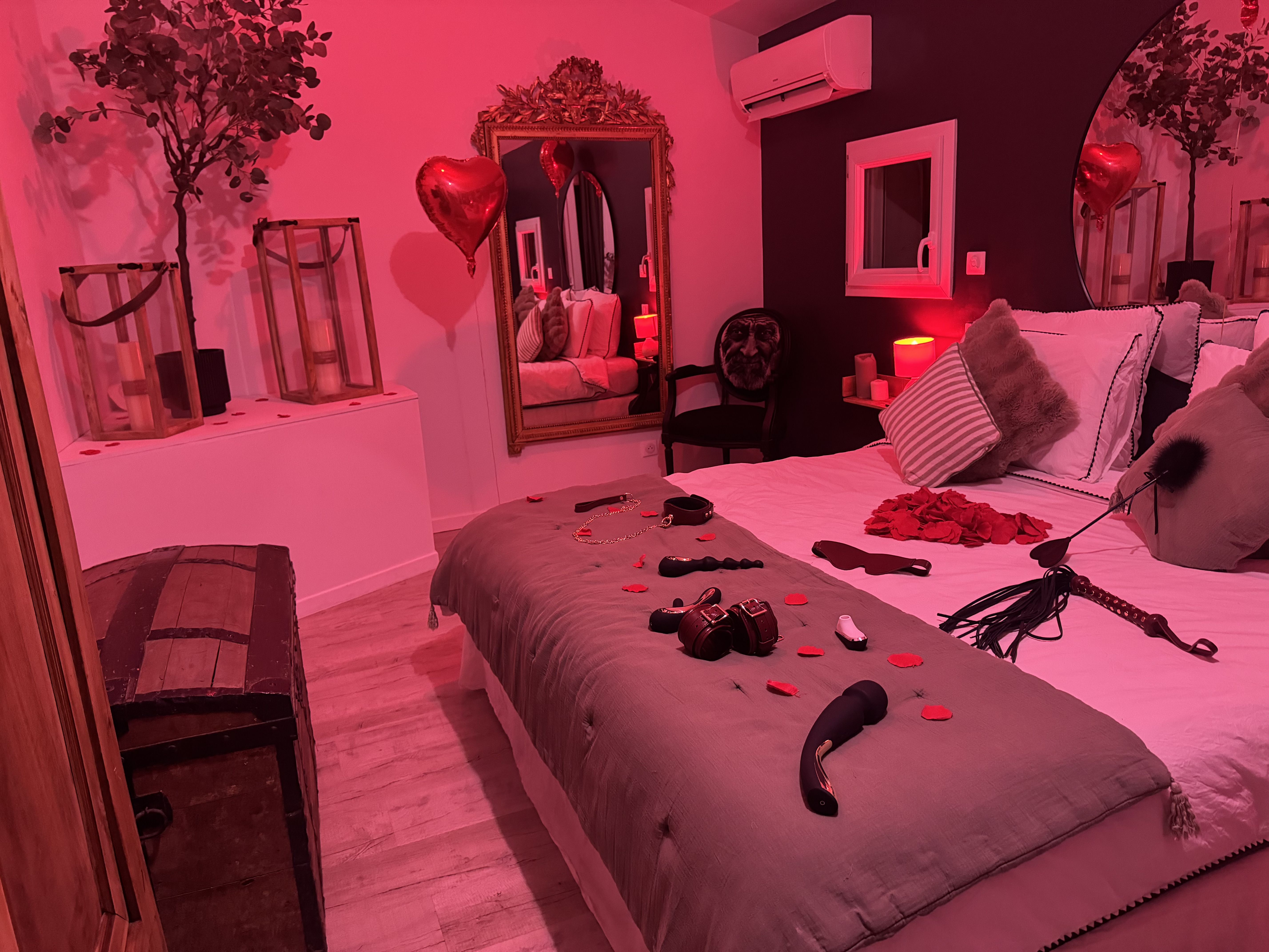 Des coffres coquins surprises sont également disponibles sur place pour vivre des expériences inédites dont une LOVE MACHINE. Côté confort, la maison dispose de deux chambres (lit king size et queen size), d’une cuisine équipée, et d’une décoration raffinée pensée pour la complicité. Personnalisez votre séjour avec nos options romantiques : pétales de roses, ballons, bouquet, bouteille de champagne...