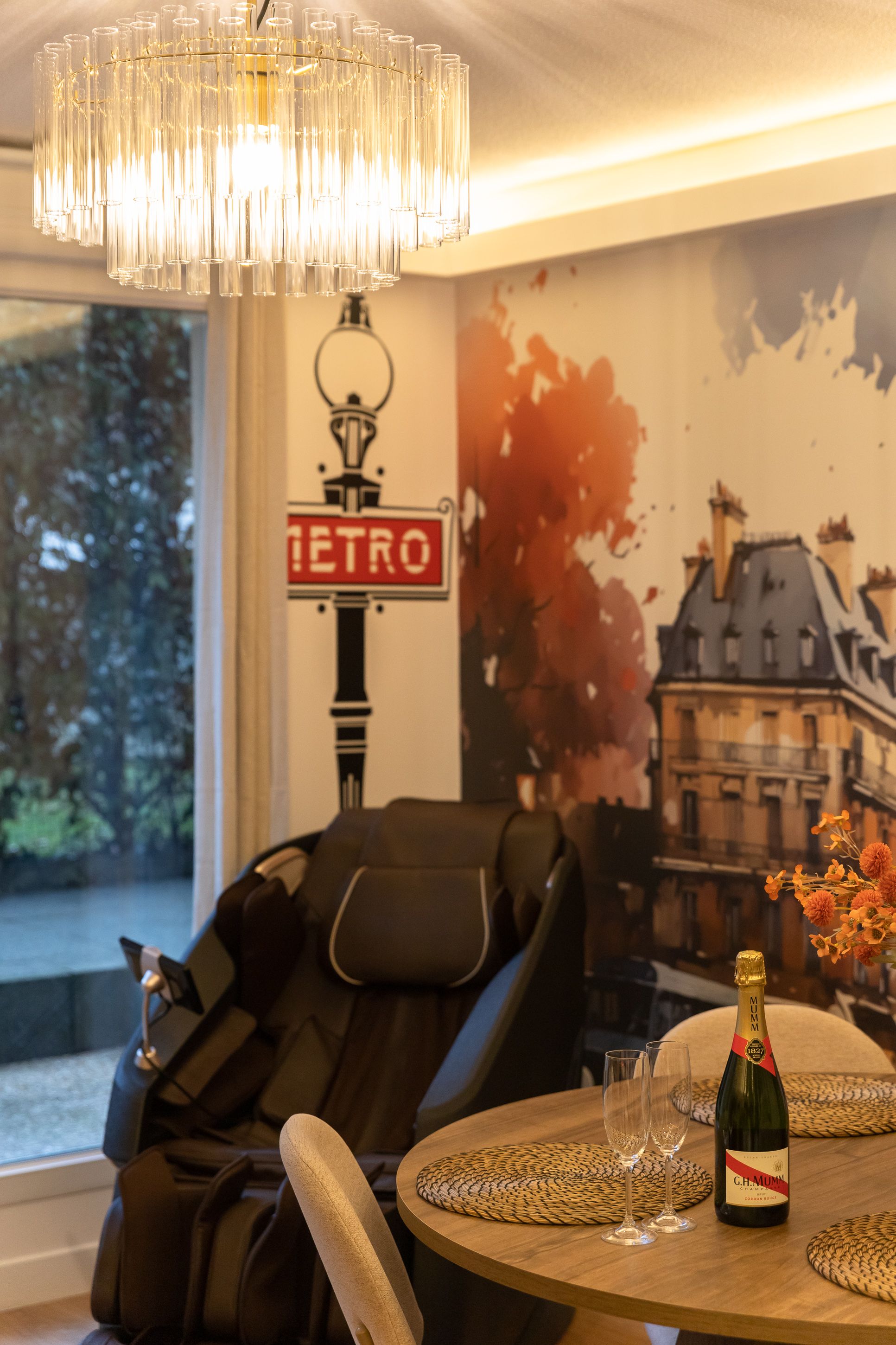 🍾 Mini-bar & décoration Paris chic (style Métro) – effet “wow” garanti, idéal pour couples et séjours premium